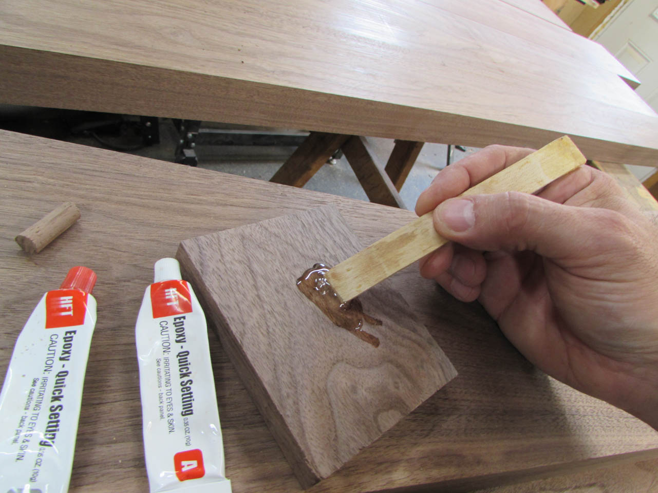 With the rest of the epoxy, I carefully filled each of the knot holes. I waited patiently for bubbles to rise out, or epoxy to sink into all the cracks, then over-filled each hole.