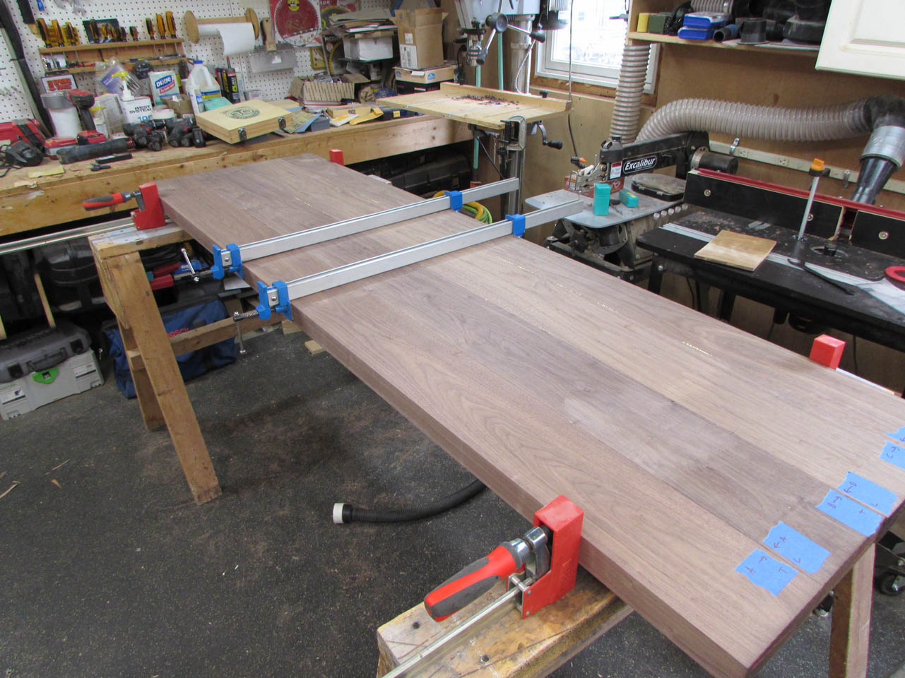 The first half was assembled on my saw horses and the second on my work bench. I really don’t have the space for a full glue-up. Nor do I have enough large clamps.