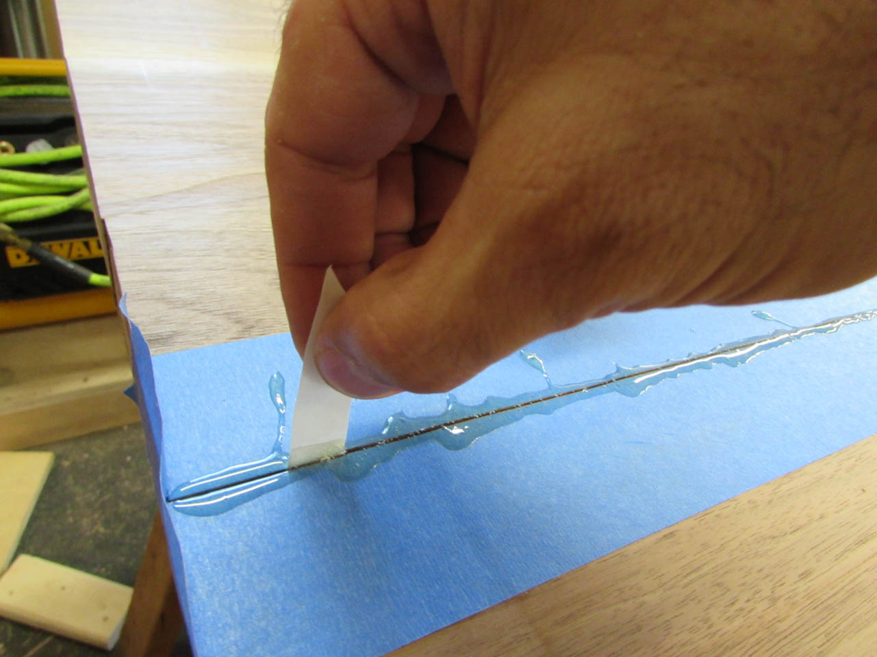 This is why I did not cut the opposite end yet. Instead I masked off the area. If any epoxy leaks out and stains the end grain, it will all be cut away later.