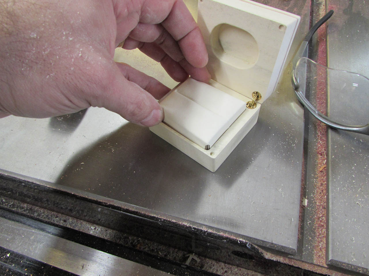 Unfortunately the ring holder was a bit too tall to let the box close so I made it a tiny bit shorter by sanding off the bottom.