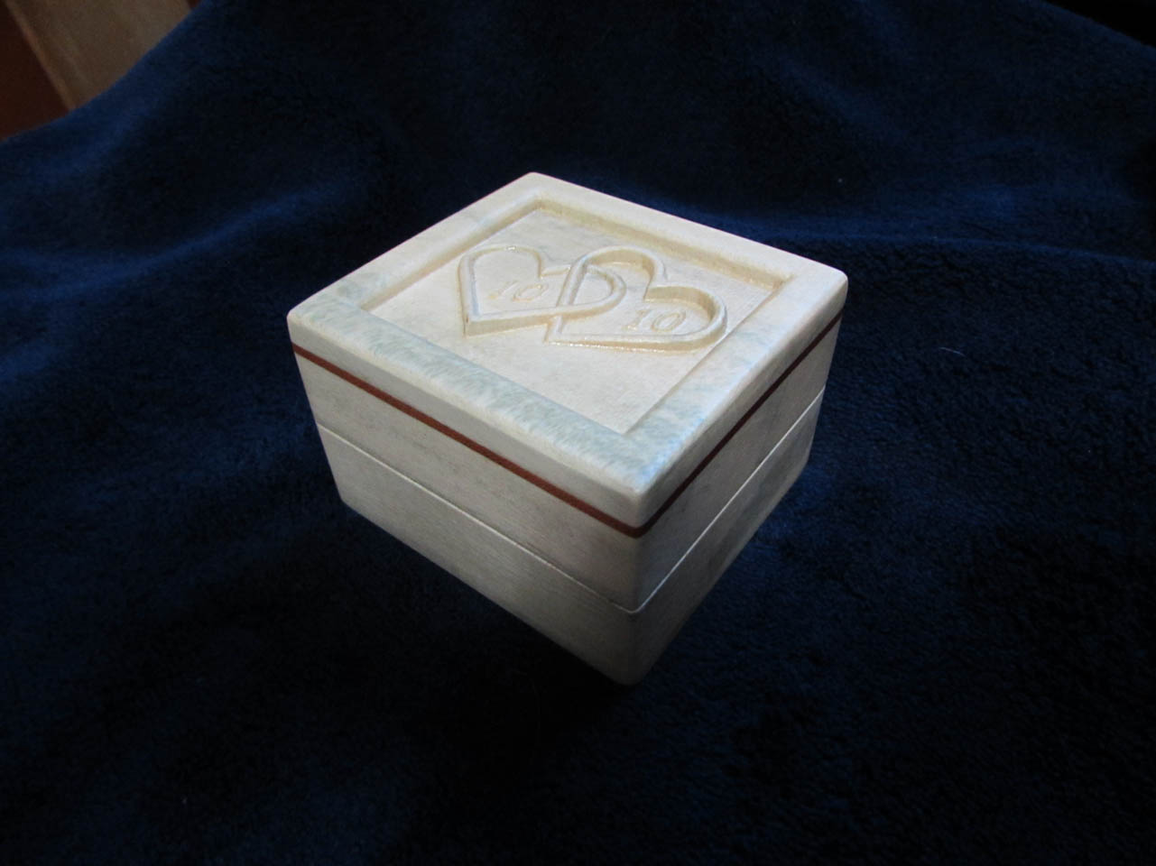 Congratulations to my son Ian, he just got engaged to a lovely young lady today. When he bought the ring a couple of weeks ago, I offered to make a ring box for it. We looked at a lot of engagement ring boxes online and he came up with a simple design that had some significance to the both of them. I wanted to use something unique for the wood so I dug into the pile of Holly that I have been drying. This tree was cut down about a year ago and I had a friend cut up several boards, from it, for me.