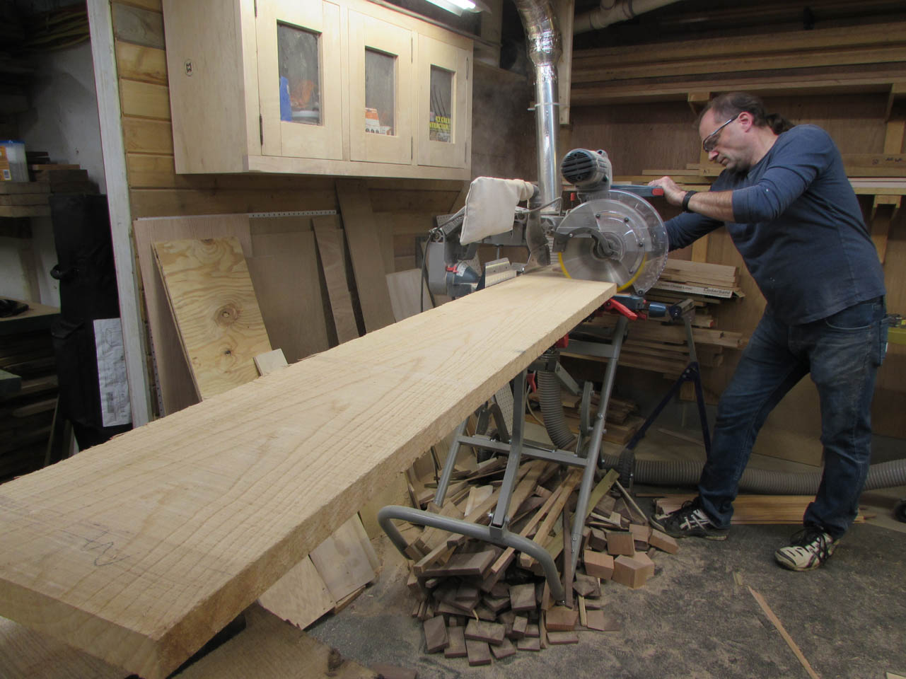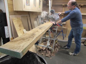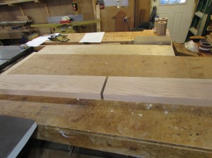 I start by cutting a piece of rough-sawn 8/4 oak into two shorter pieces, then clean up one edge on my jointer.
