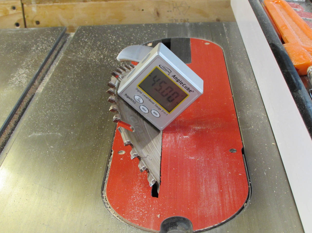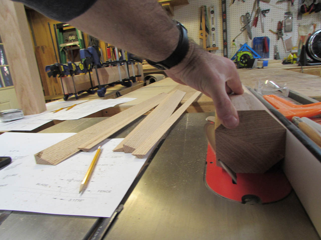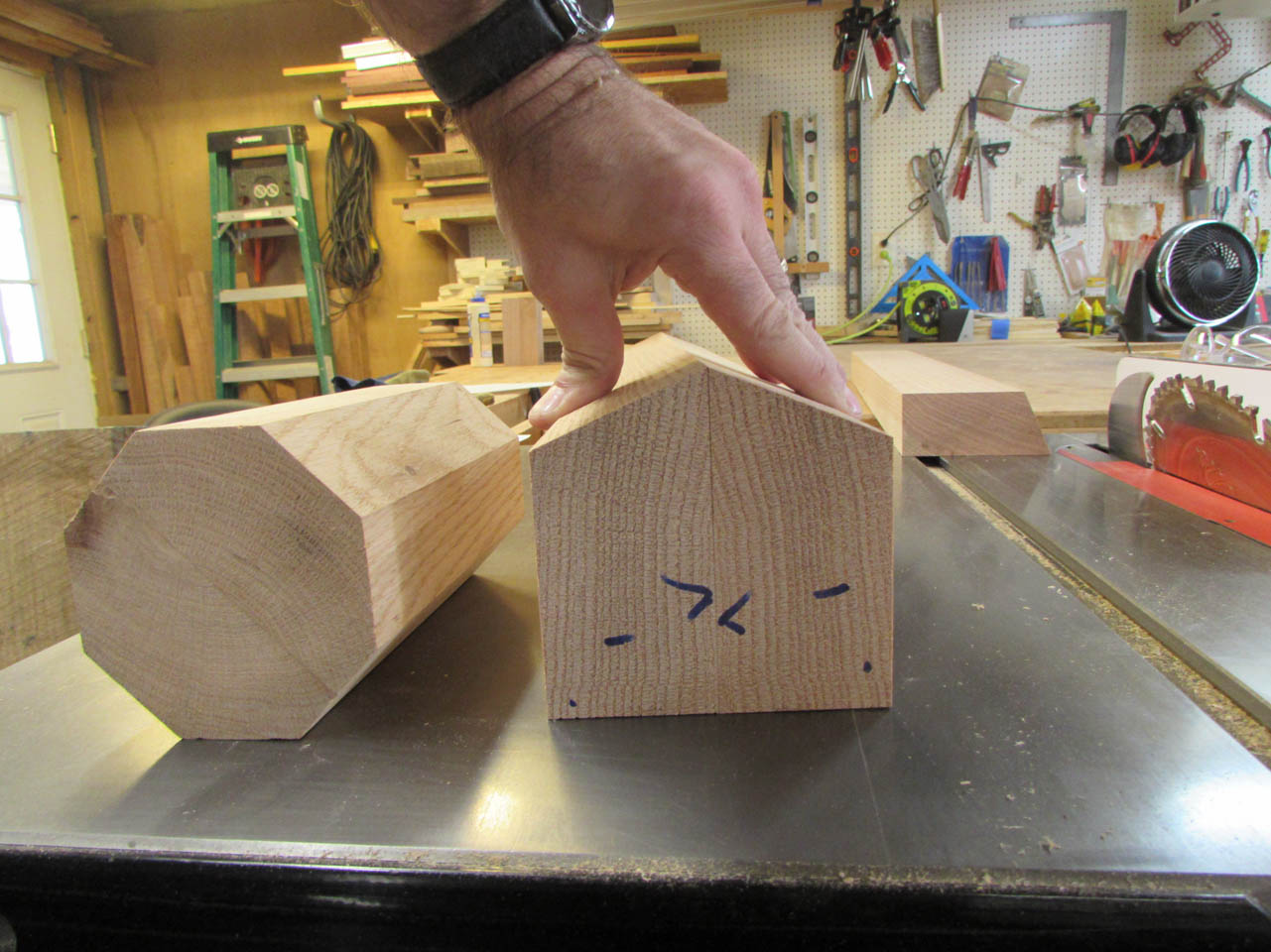 With all four columns dry, I set my saw blade to 45 degrees to cut the second facet on the columns. My drawing shows the exact fence location for this first cut, as well as the fence location for the next 6 cuts.