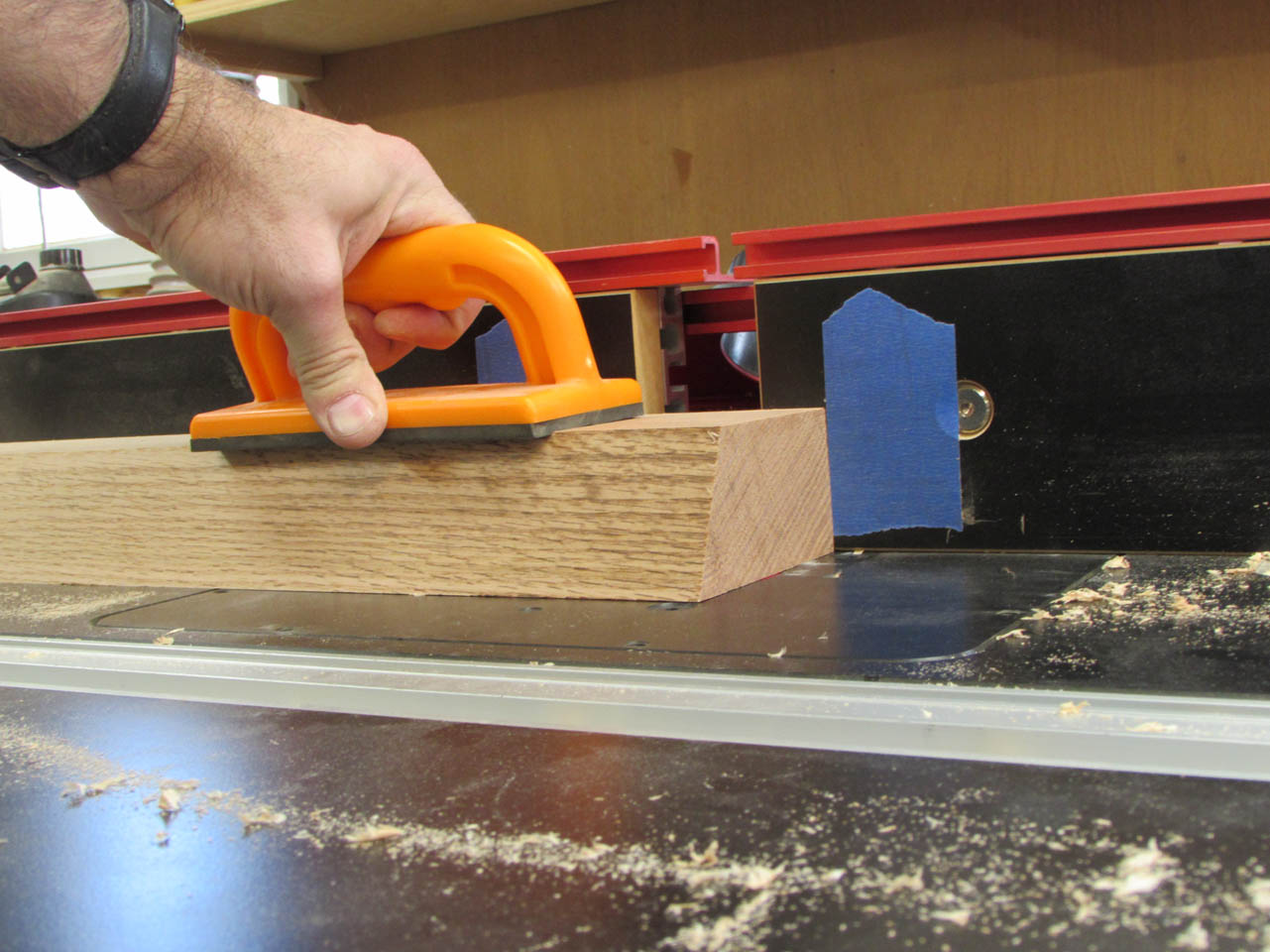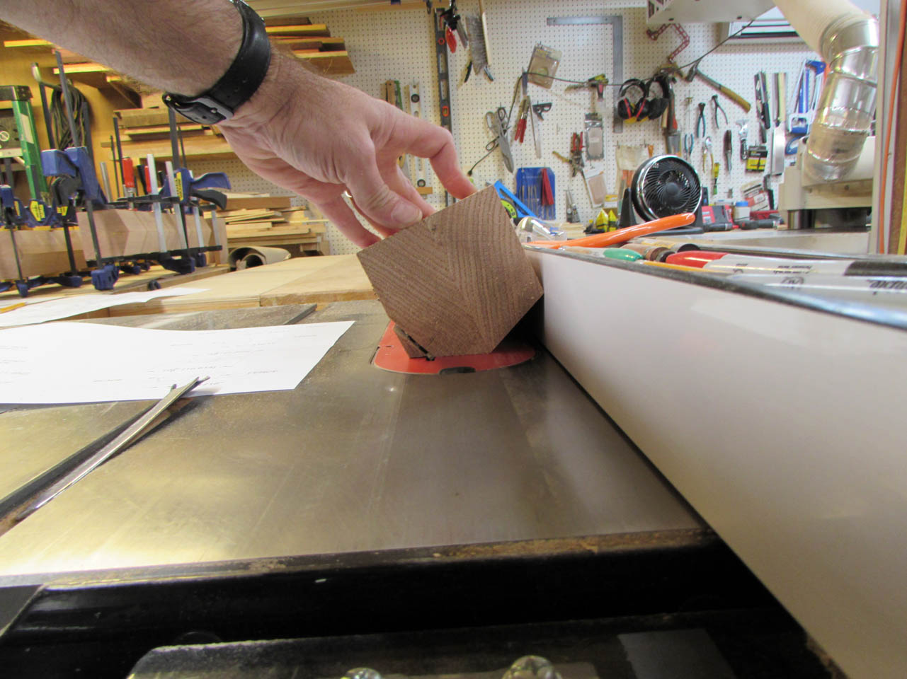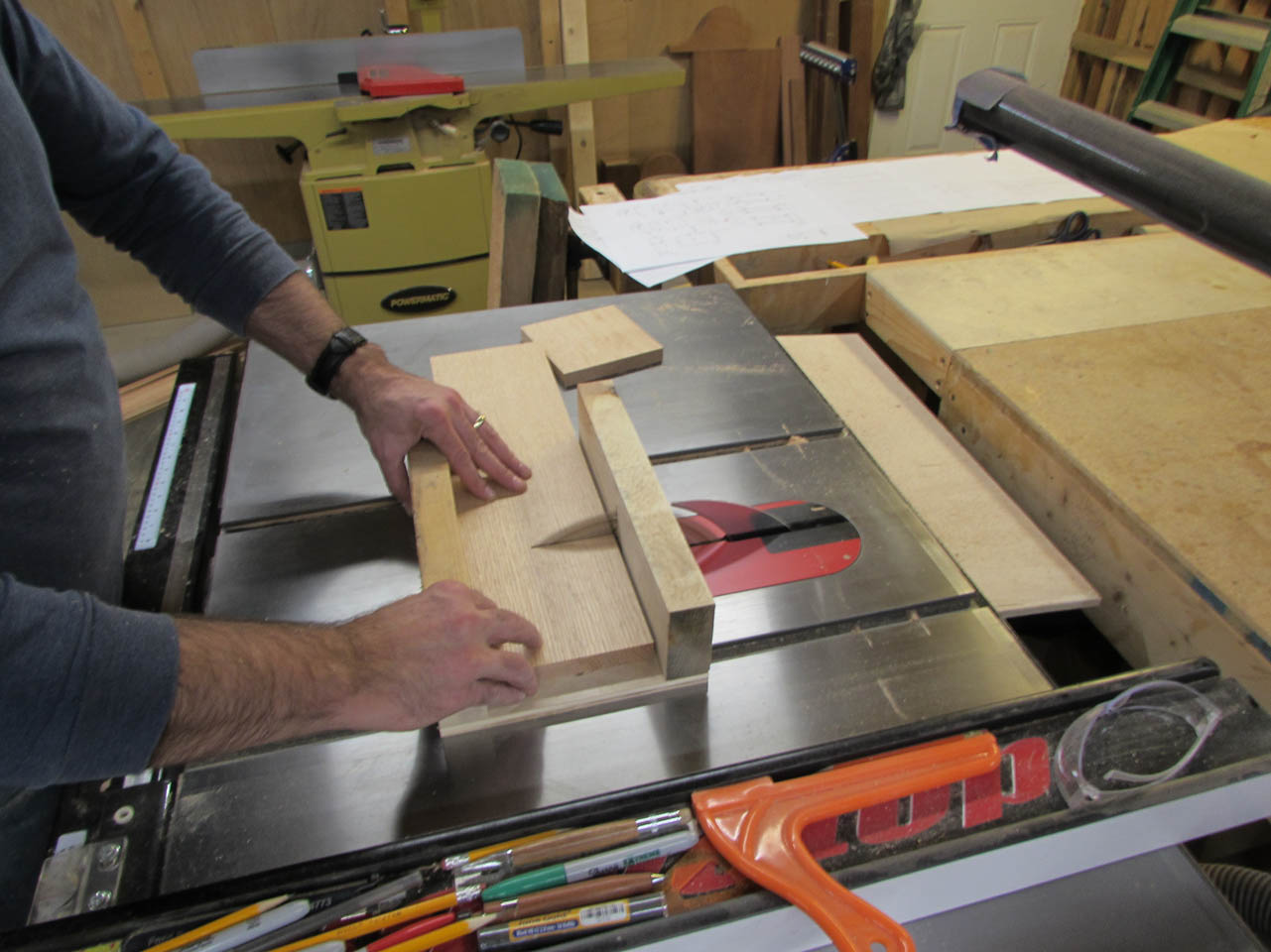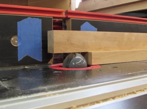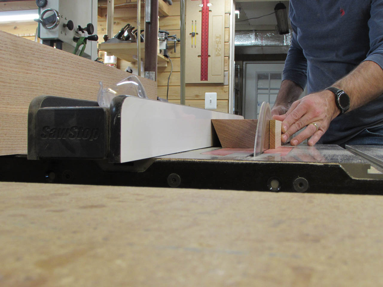 I decided to use my tiny cross-cut sled to cut the board into four separate 5-1/2″ pieces.