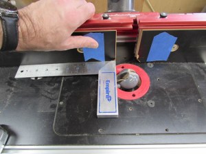 I installed the 2″ core box bit into my router table, then placed tape on the fence to mark my start and stop points of my cuts.