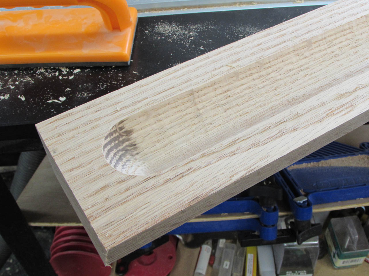 The bit is so big that I am making the cut in two passes. I drop the board down onto the spinning bit, holding the board steadily with both hands.