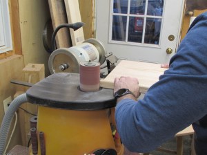 The glue on the book ledge is dry so I pulled the clamps and brought the panels over to my oscillating spindle sander to round off the corners.