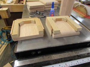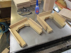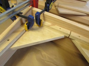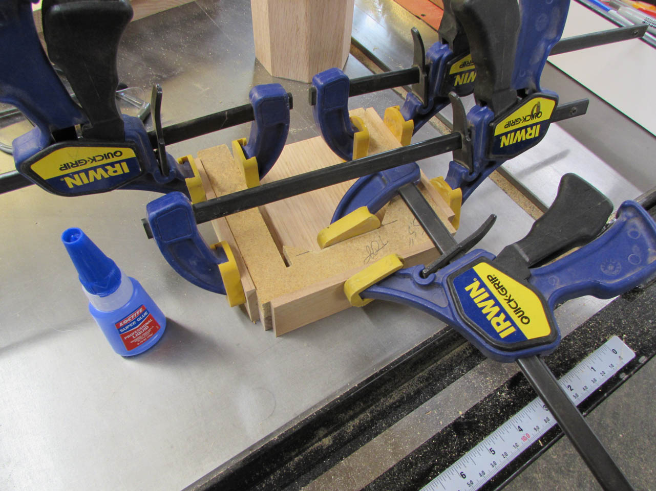 I tucked the vertical walls tightly against the spacers then used the off-cut angles from the sides as clamping cauls to hold the sides in place while the glue dried.
