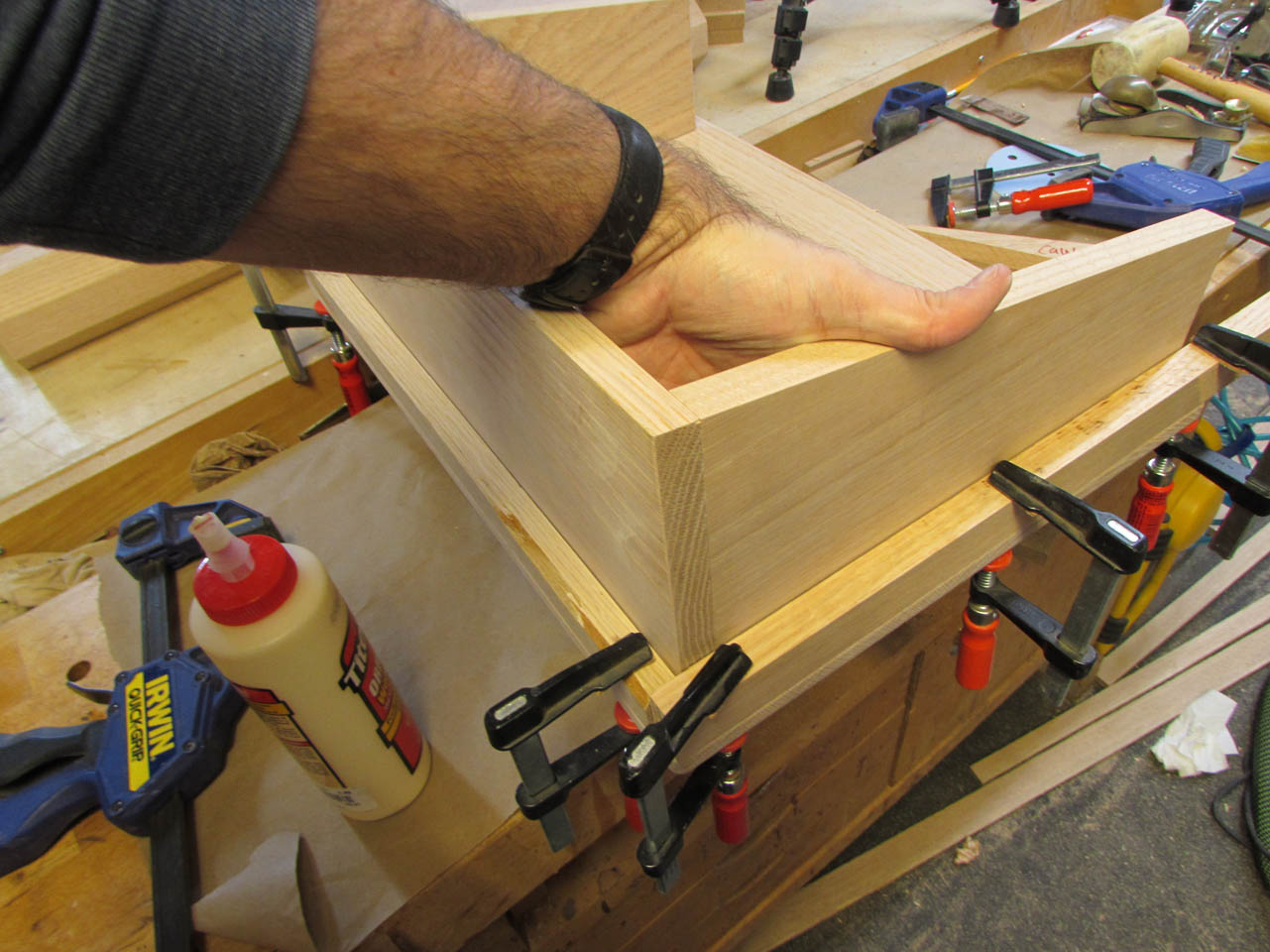 I made some slight adjustments to align the top, then clamped on some 90° corners to keep everything square while the glue dried.
