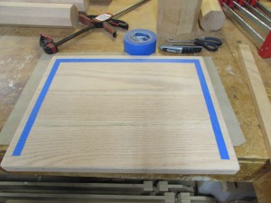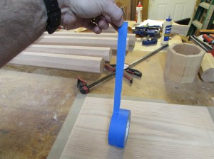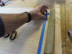The pieces of tape are applied to the marked location as well as the top edge of the sides, so these areas will be masked off during the finishing process.