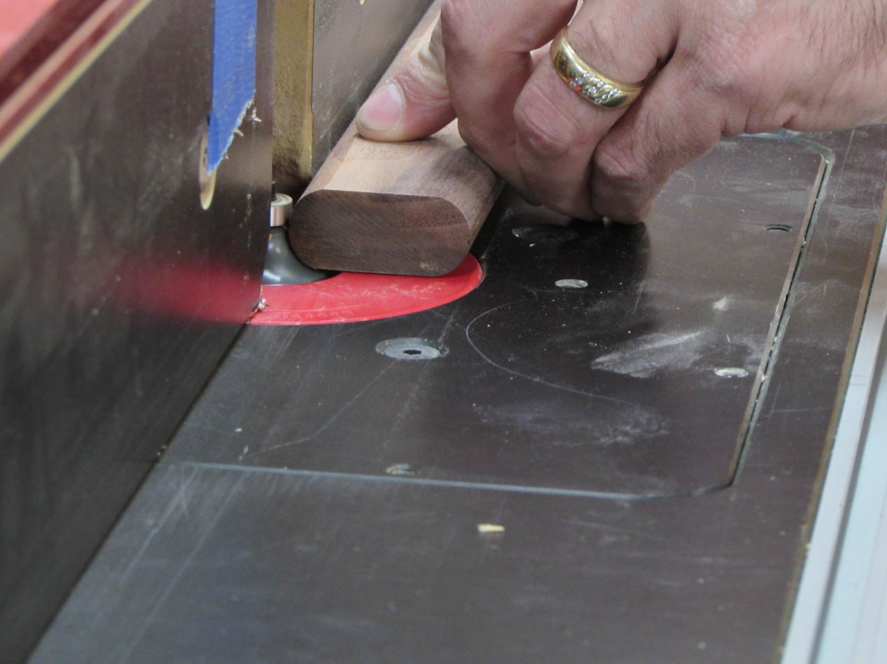 I took all the sanded boards over to my router table and set up the 3/8″ round-over bit. I made four passes to create a full 3/4″ bull-nose on each side.