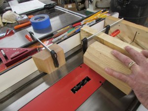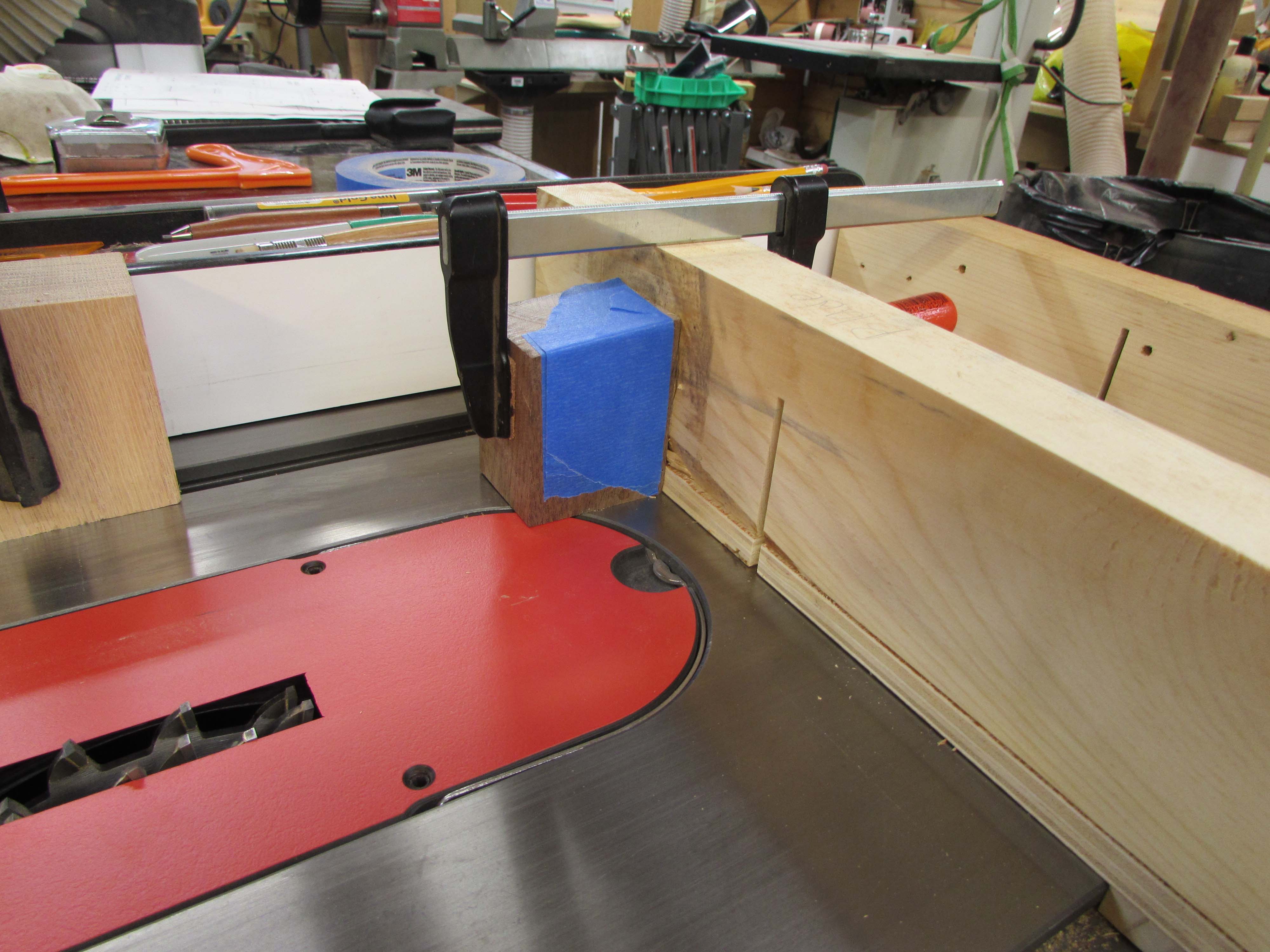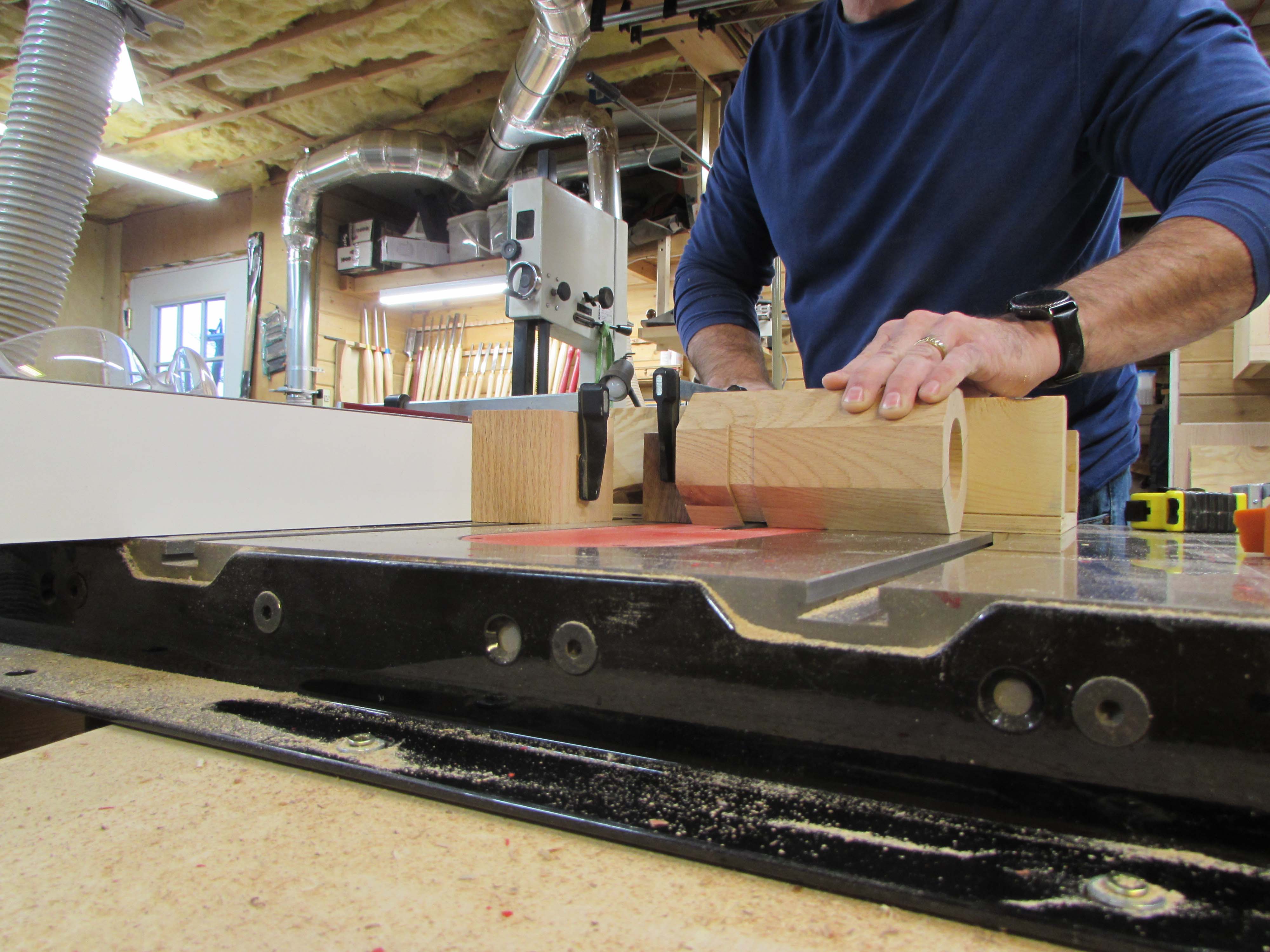 To cut the channel in the columns, I set up a few stop blocks on my small cross-cut sled and fence. The one on the sled sets the groove 1-1/2″ from the end and the one on the fence keeps me from cutting the dado into the sled itself…