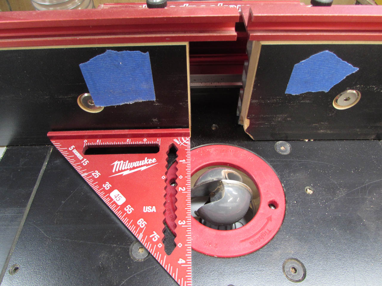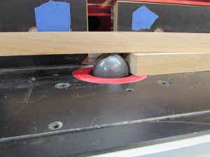 I put my 2″ core box bit into my router table and set it for about 1/2″ deep to make the first pass. I also set the fence so that my start and stop marks were 1″ to either side of the bit, and so the bit fell center on my leg blanks.