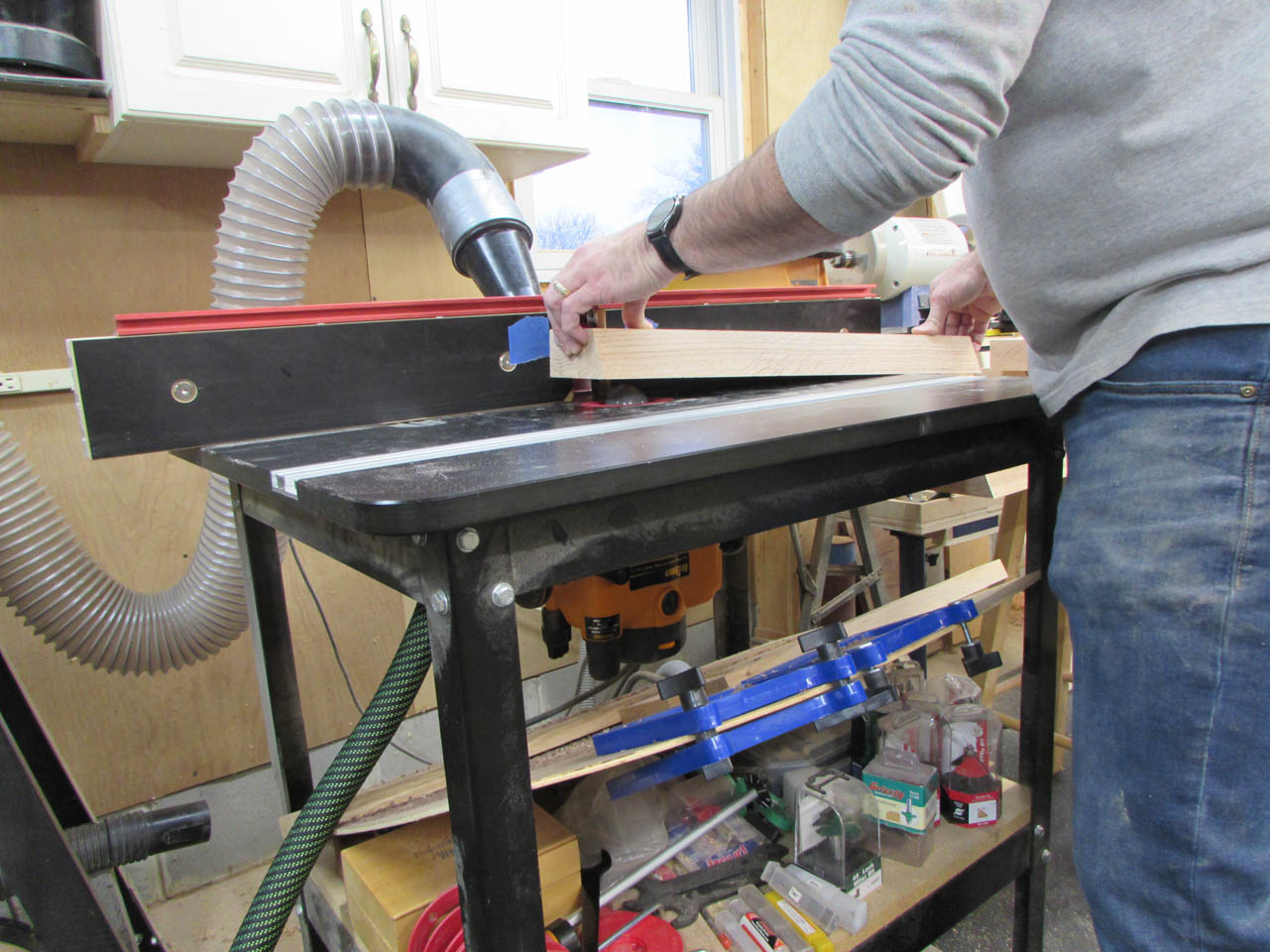 Then I dropped the first leg blank onto the bit, holding it tightly in place and slowly cut the first pass on all eight boards.