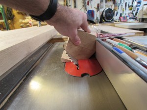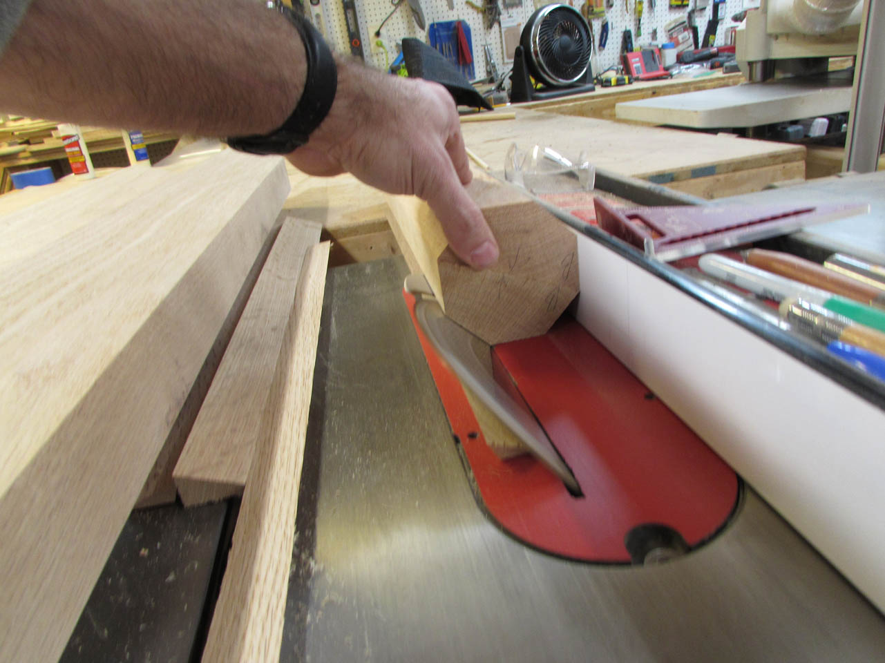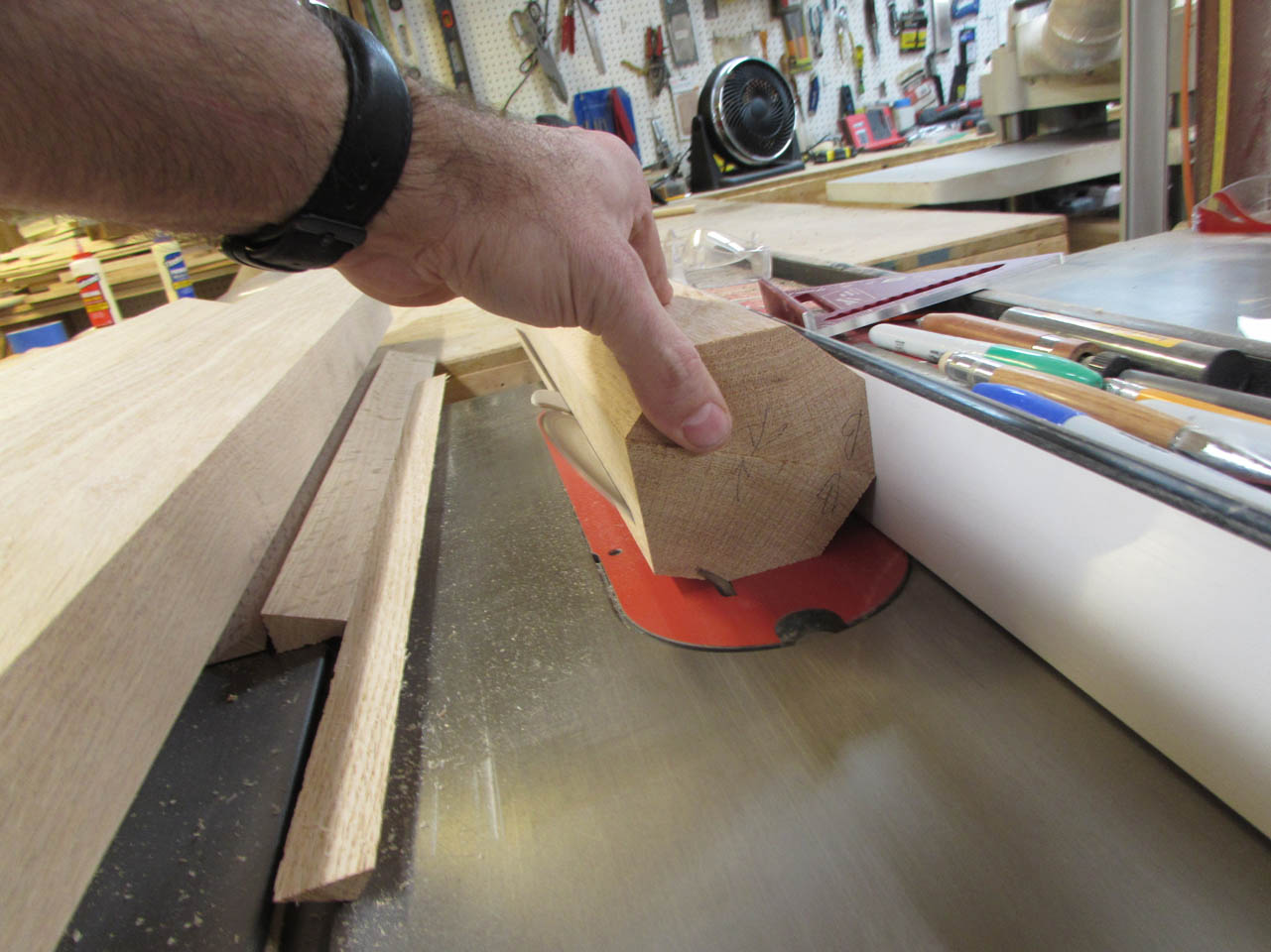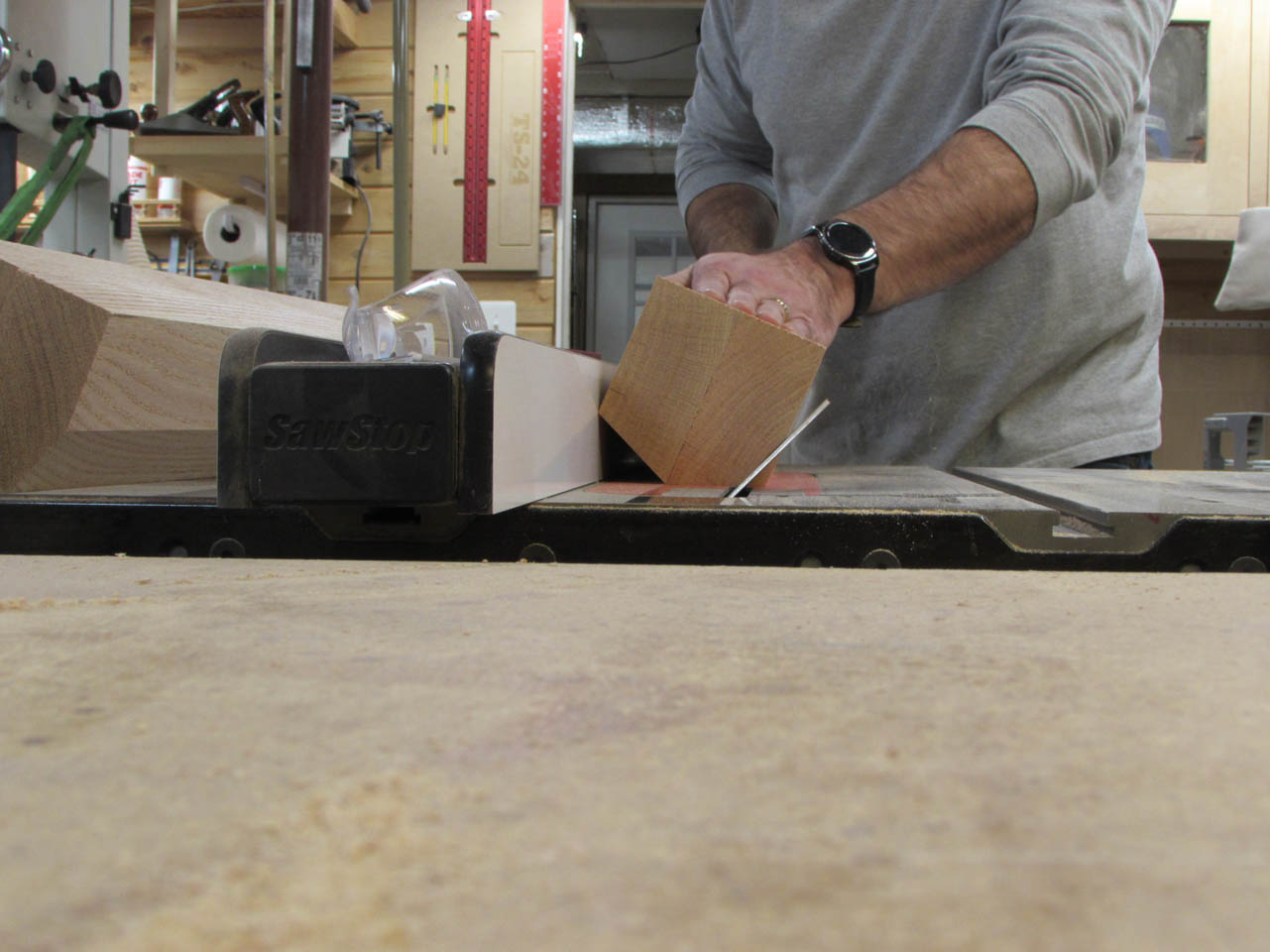 When the glue was dried, I sanded off any squeeze-out. I set the table saw blade to 45° and the fence to the correct location for the first pass.