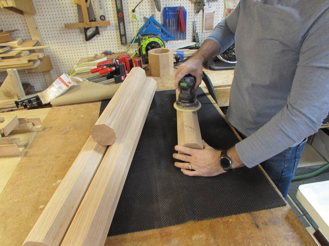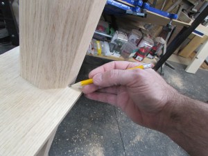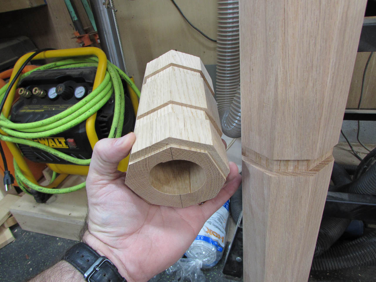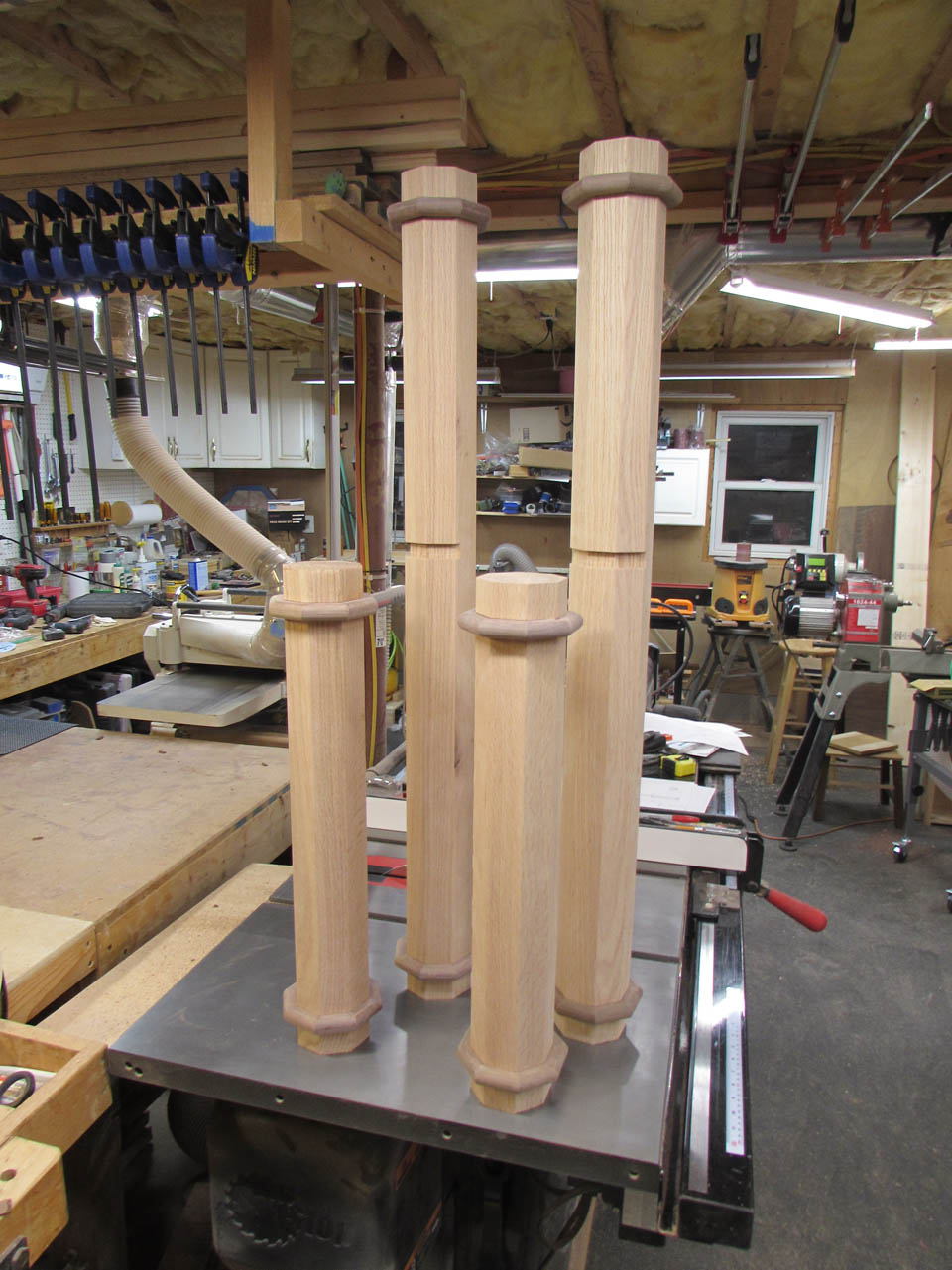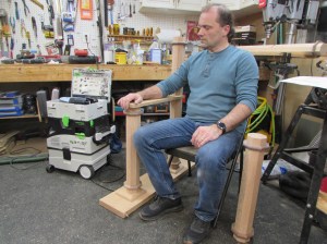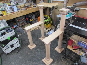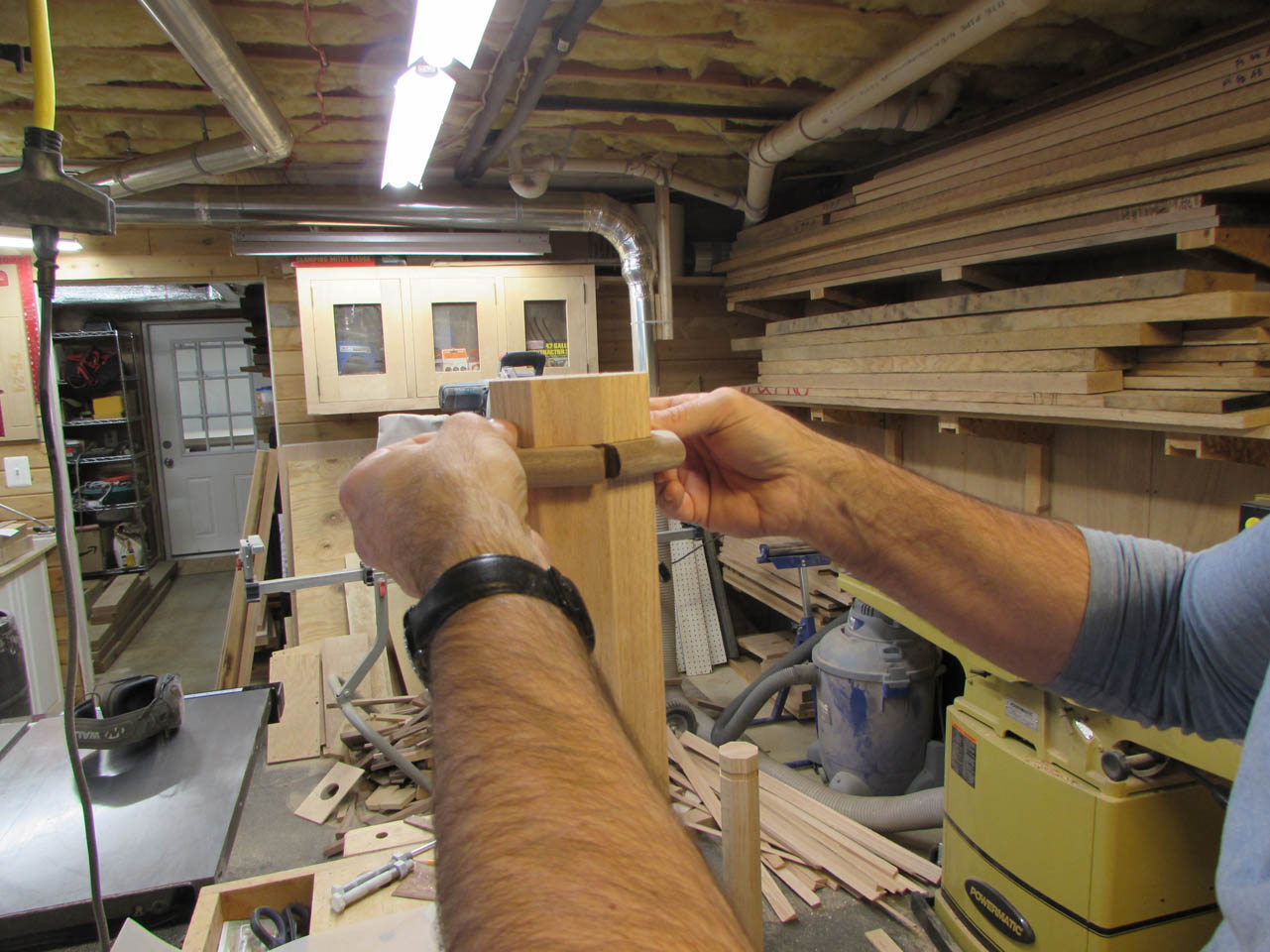These were cut out on the band saw, then I installed one and placed the columns up on blocks to mimic the finished height. I grabbed a chair and sat in it to test the arm height. It seems to be at a comfortable level.