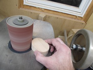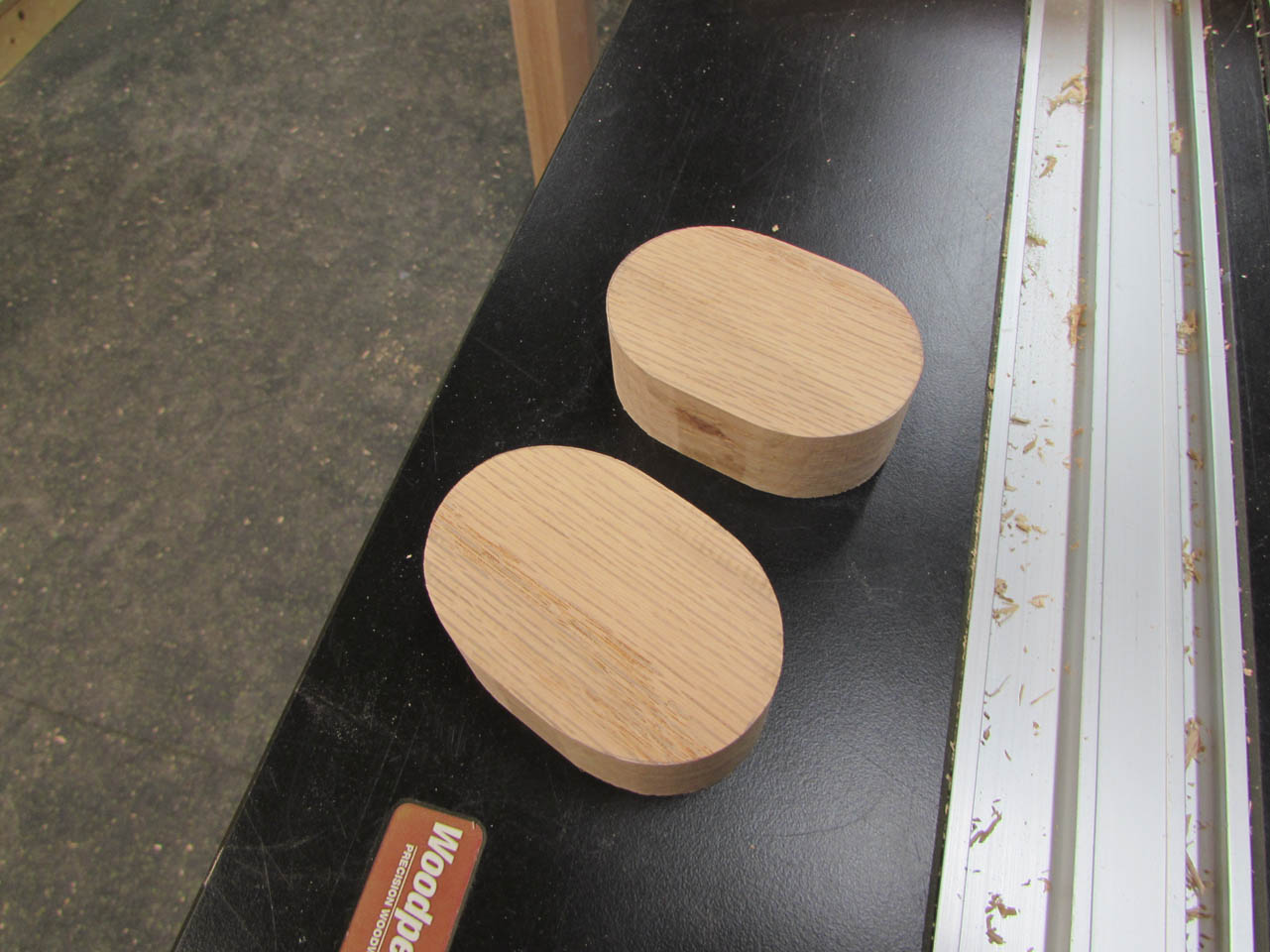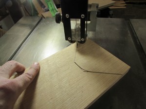 The last funky little piece is the mid-span connection for the back. I am not entirely sure what size and shape it will wind up, but I am starting with rounded ends. I traced the base of a bottle that was just the right size, then cut my curves on the band saw.