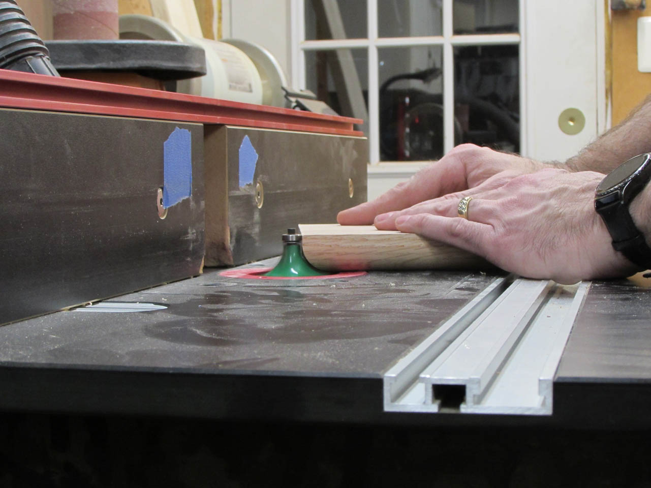 After they were cut, I set up the 3/4″ round-over bit in the router table and trimmed the base caps.