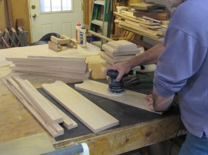 With just about all the parts cut out, it was time to start sanding. I took everything down to 180 grit in preparation for glueing up the legs.