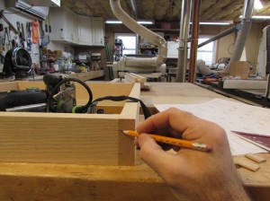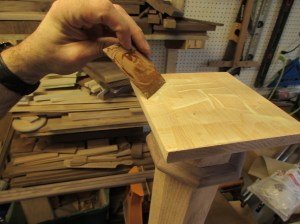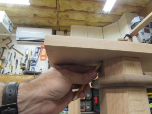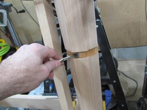 With the arms back in place, I started marking every connection to the columns. I intend to mask these areas so that I can pre-finish the chair in pieces, then glue it back together at these locations.