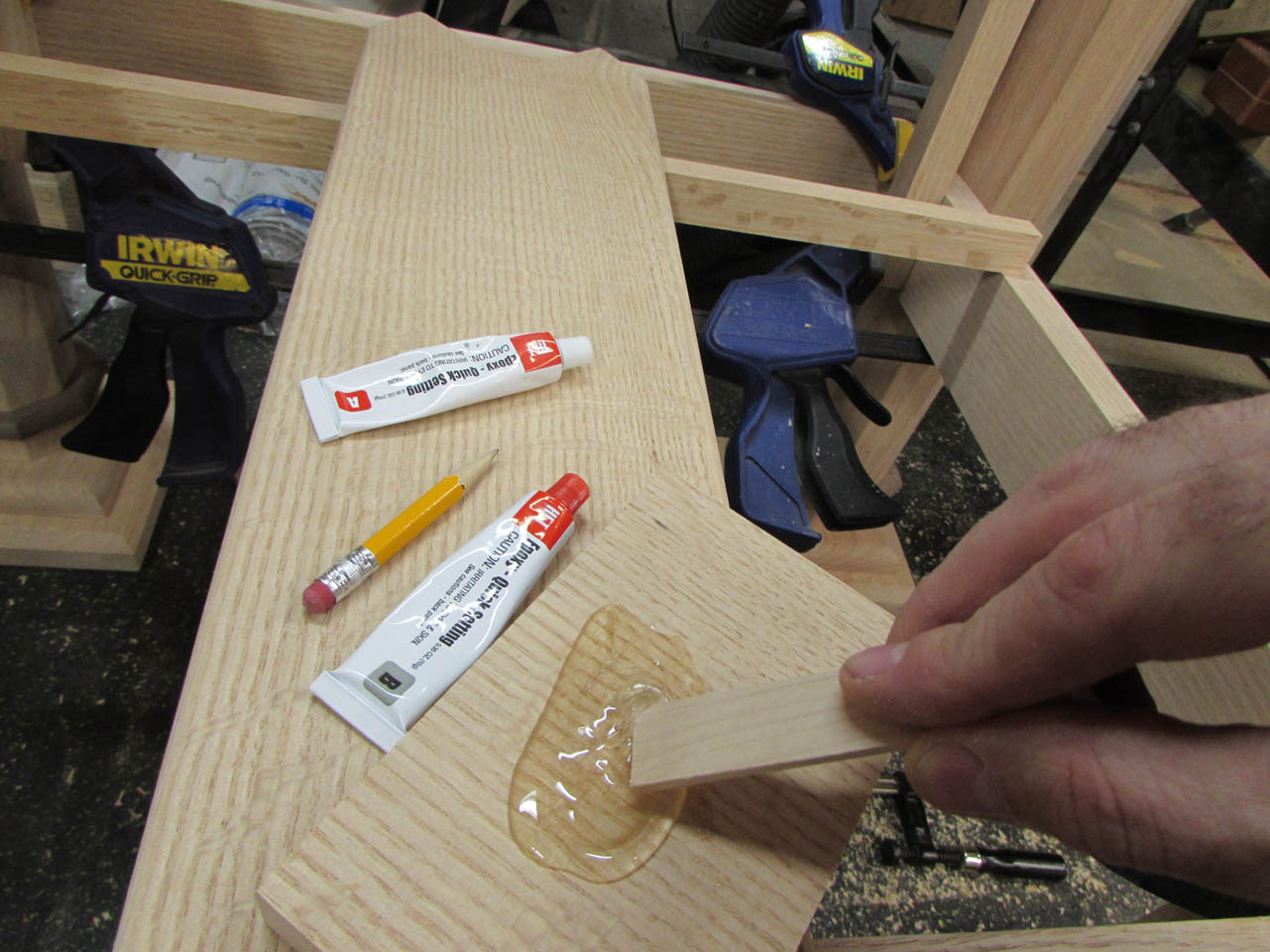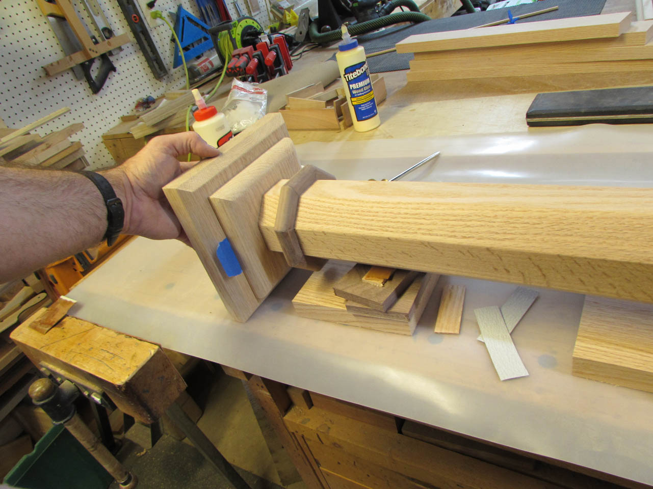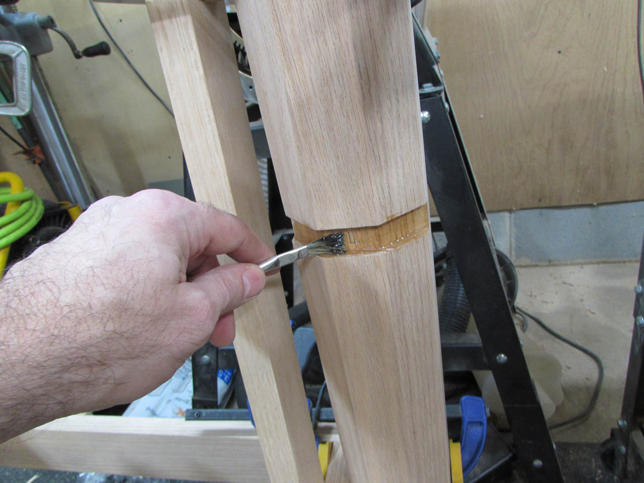 Next I mixed some two-part quick-set epoxy and applied it to the arms for assembly. Being an end-grain glue-up in an awkward location, epoxy is the best choice.