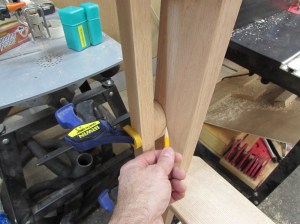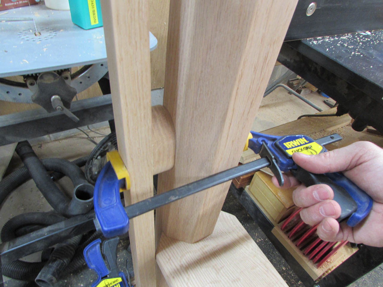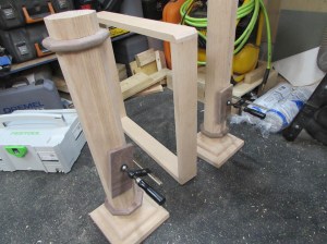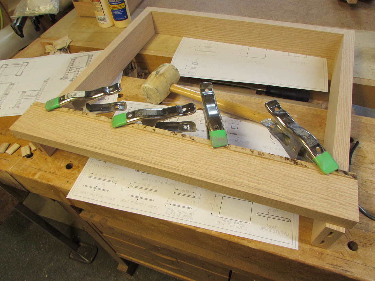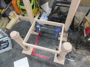 I squared and aligned the bases of the columns and clamped the seat frame in place.