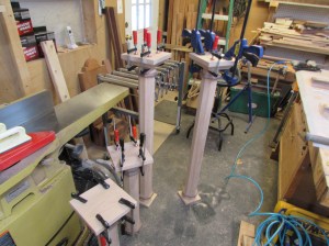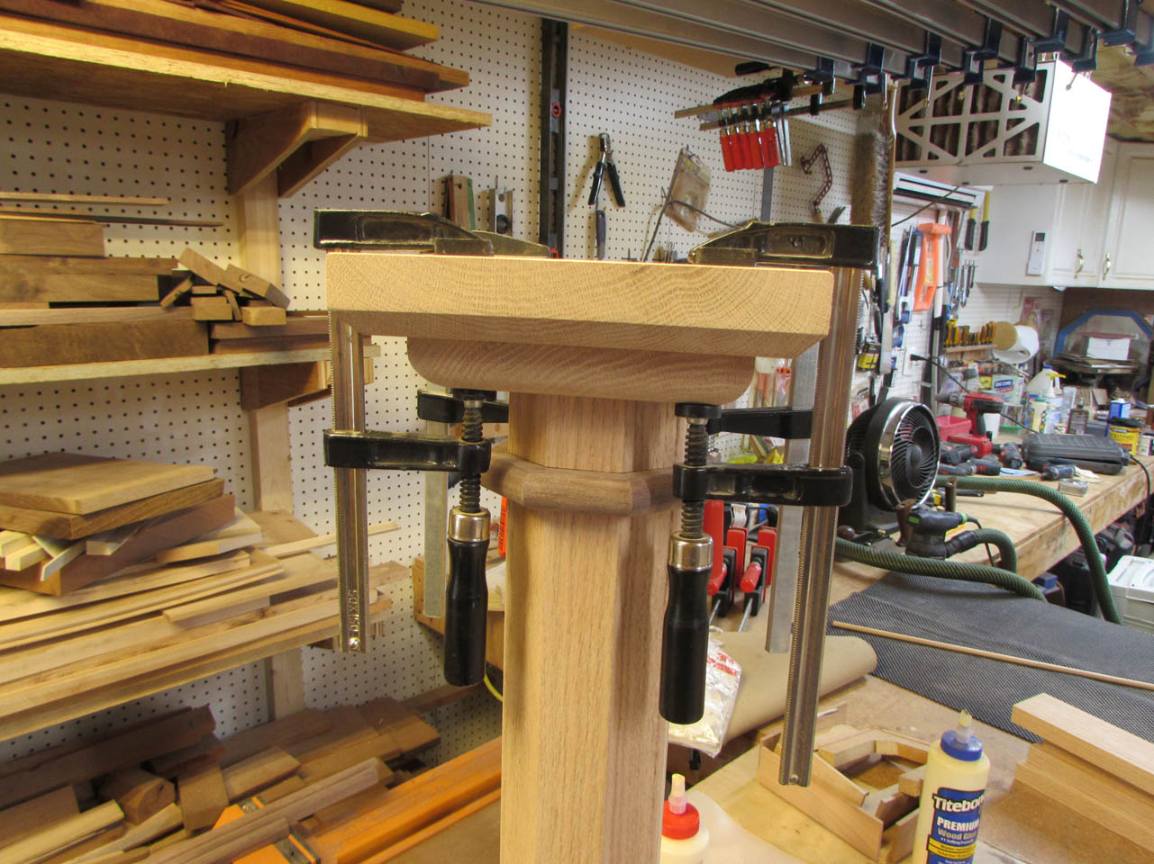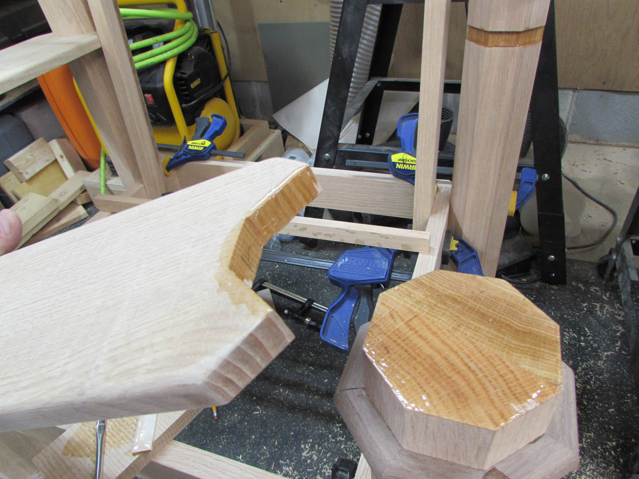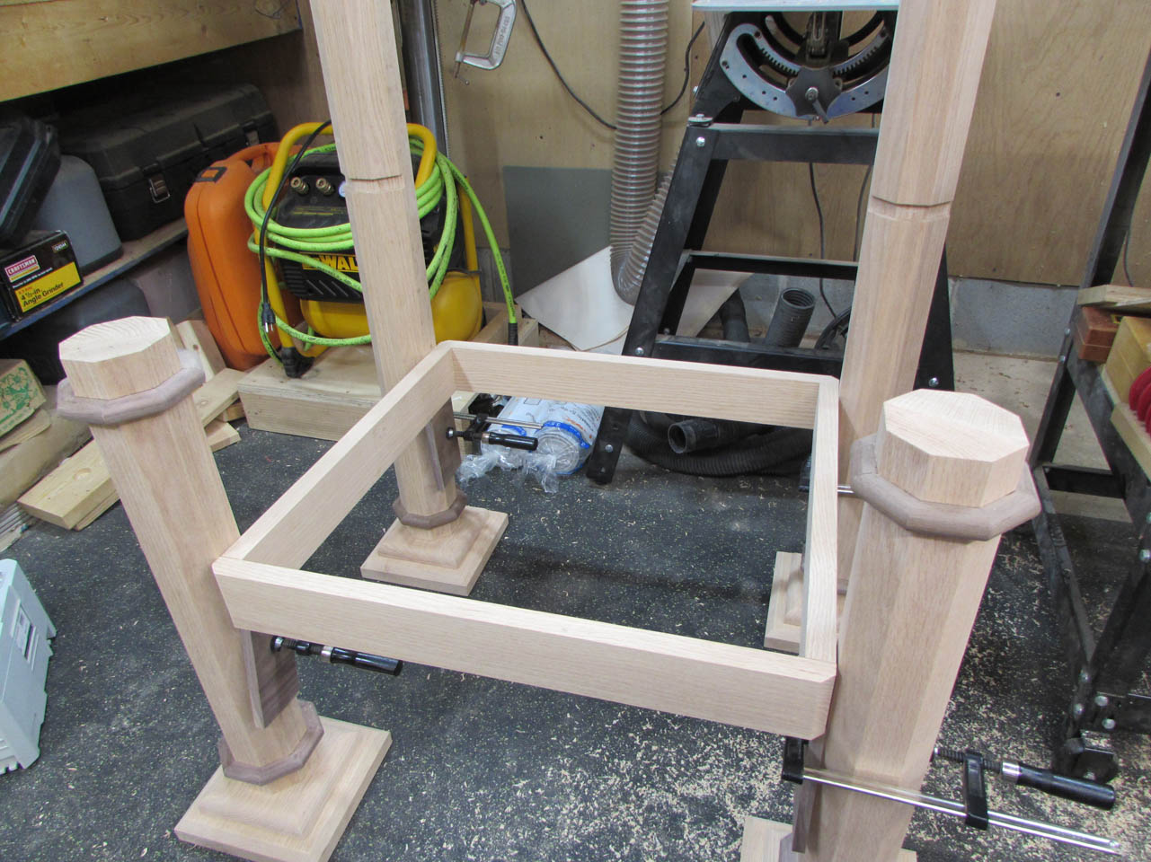 I squared and aligned the bases of the columns and clamped the seat frame in place.