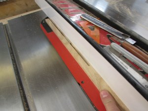 The front face of the seat frame needs to be angled a bit so that it sits parallel to the columns even though the seat itself will be angled back a few degrees. To achieve this slight angle, I cut a strip of wood, 1/8″ thick.