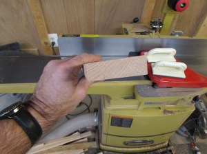 This little strip angles the board about 3° as I run it across the blade of the jointer.