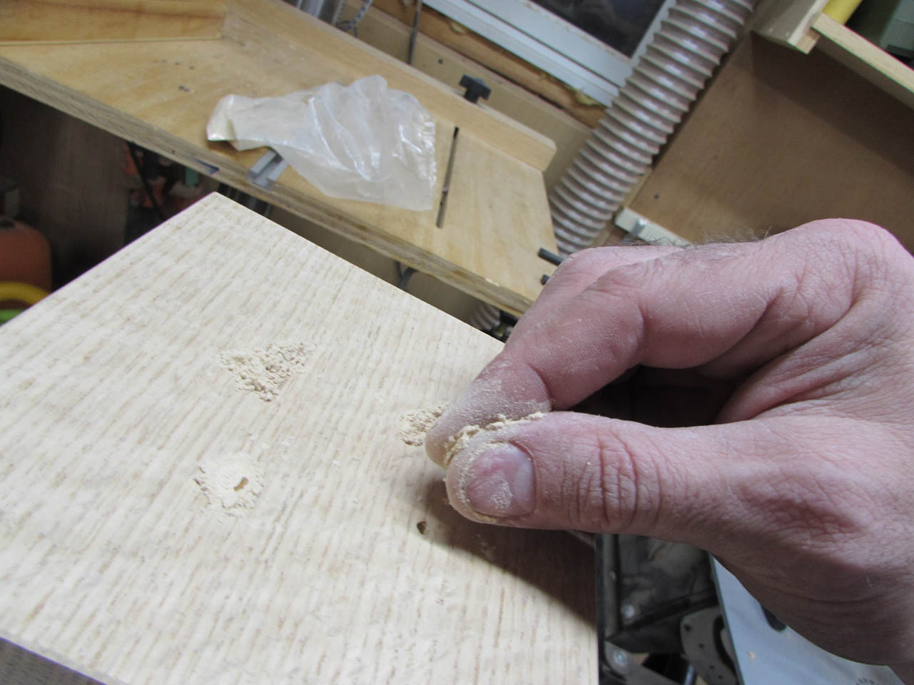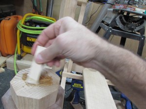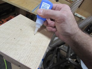 The final thing I am doing this weekend is filling the brad nail holes in the arms and column caps. I placed a small drop of CA glue into each nail hole, then filled the hole with fine oak sawdust.