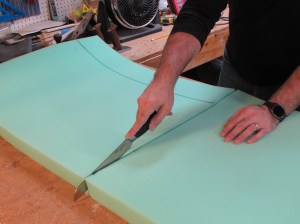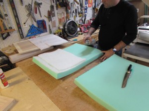 Next, I used the panel as a template to mark my 2″ high density foam. Then I used a bread knife, in multiple slow passes, to cut the foam.