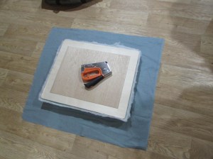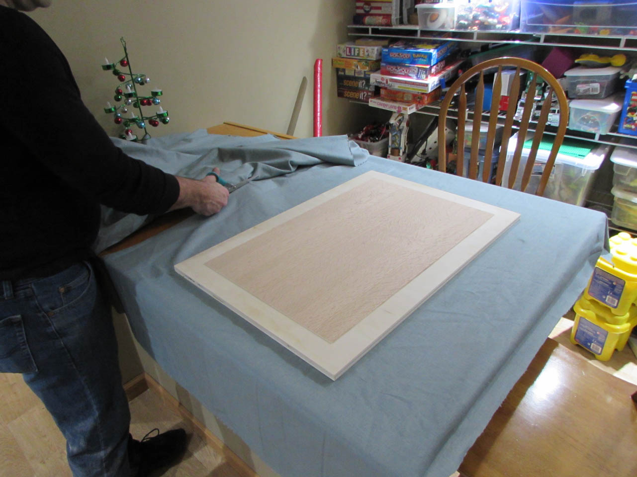 I moved to a clean work table to cut and attach the fabric. Not sure of how much I would need, I left a lot of extra fabric to work with.
