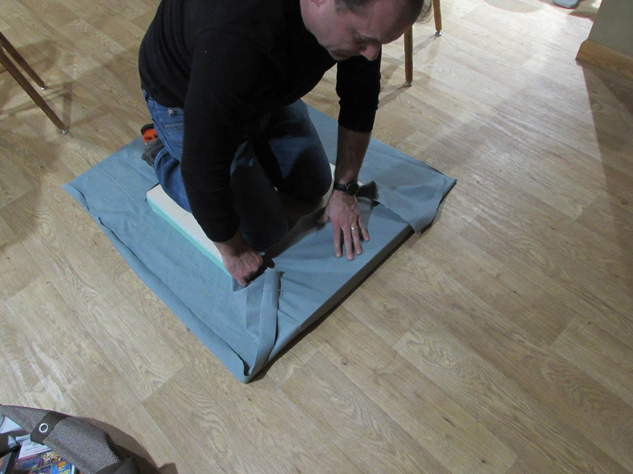 Once that was done, pull the fabric at a 45° angle from the center and staple till about 3″ from the end. Being careful to keep even smooth lines along the foam.
