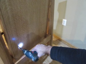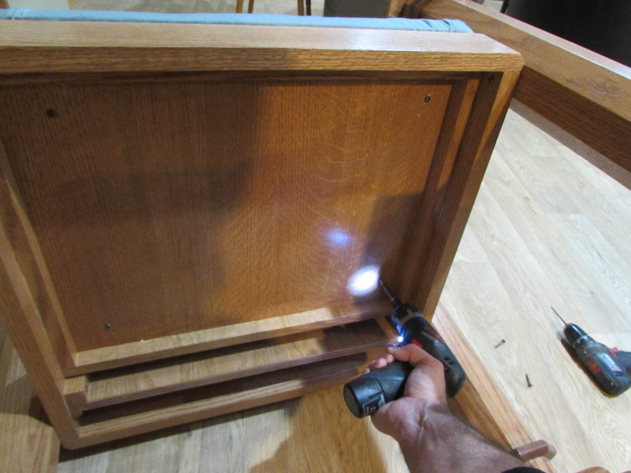The first panel slid into place perfectly so I pre-drilled four holes in the back panel and attached the cushion panel with four 1-1/4″ screws.