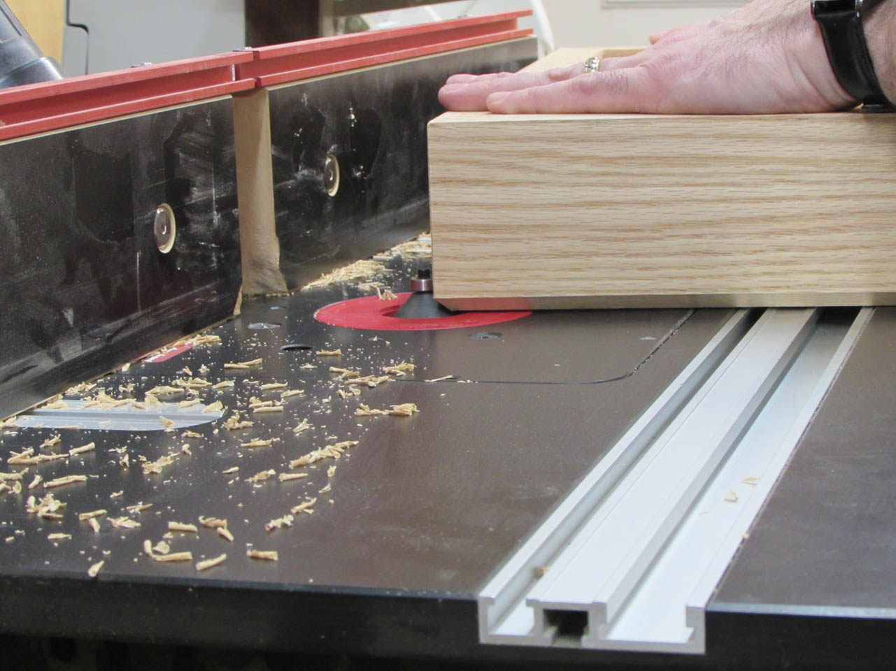 The glue is dry on the mobile base so I pulled the clamps and took it over to my router table to cut a chamfer along the top edge.