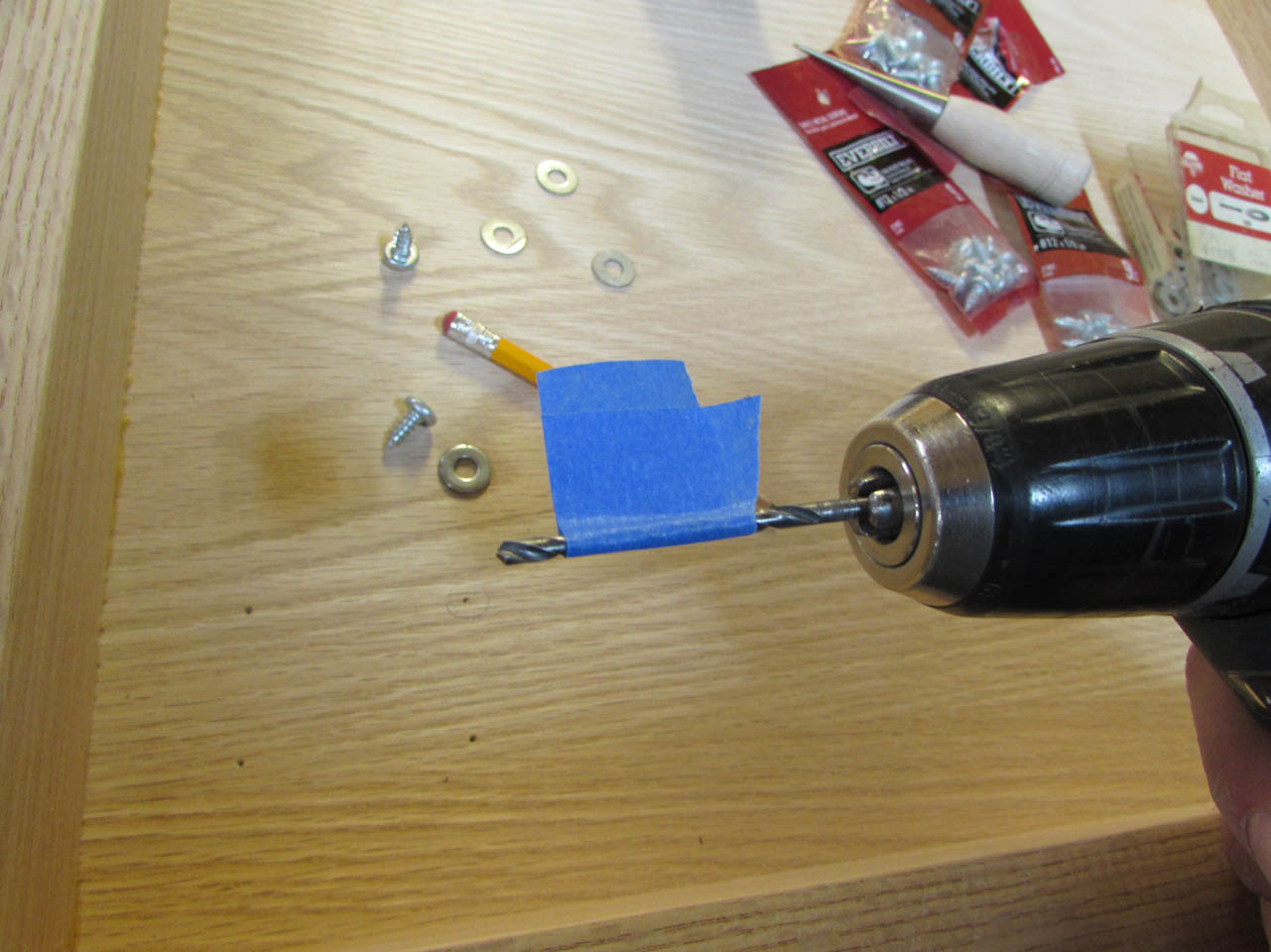 Then I attached a piece of tape to my pilot drill bit to act as a depth stop, as I pre-drilled all of the mounting holes.