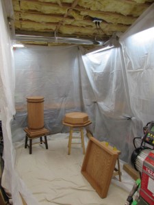 I waited a day for the stain to cure, then started putting up the plastic to create my temporary spray booth.