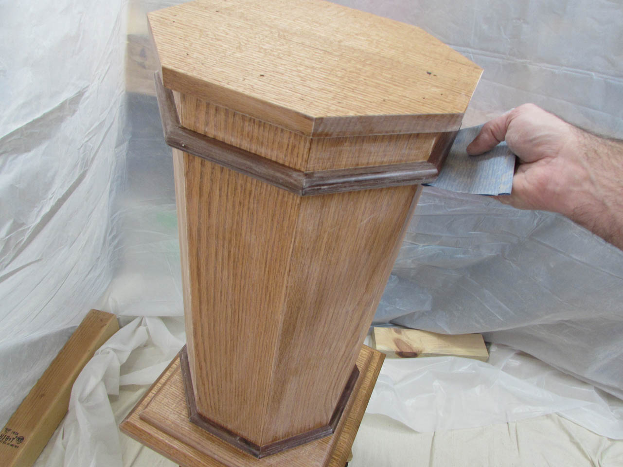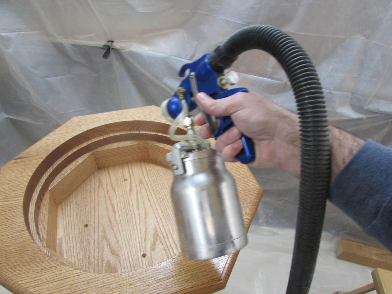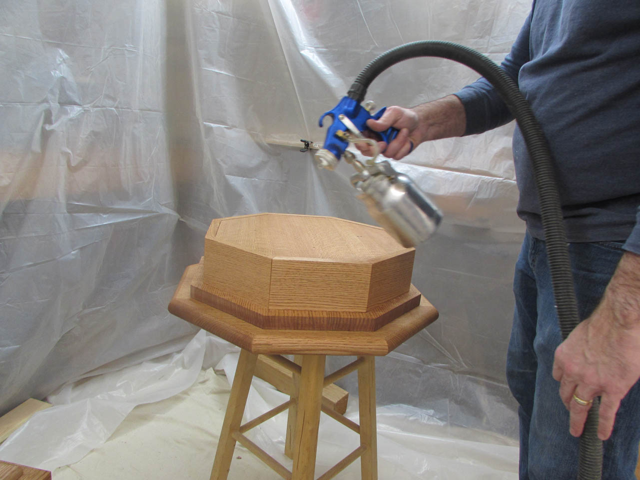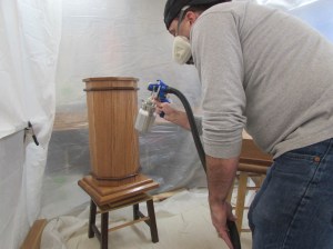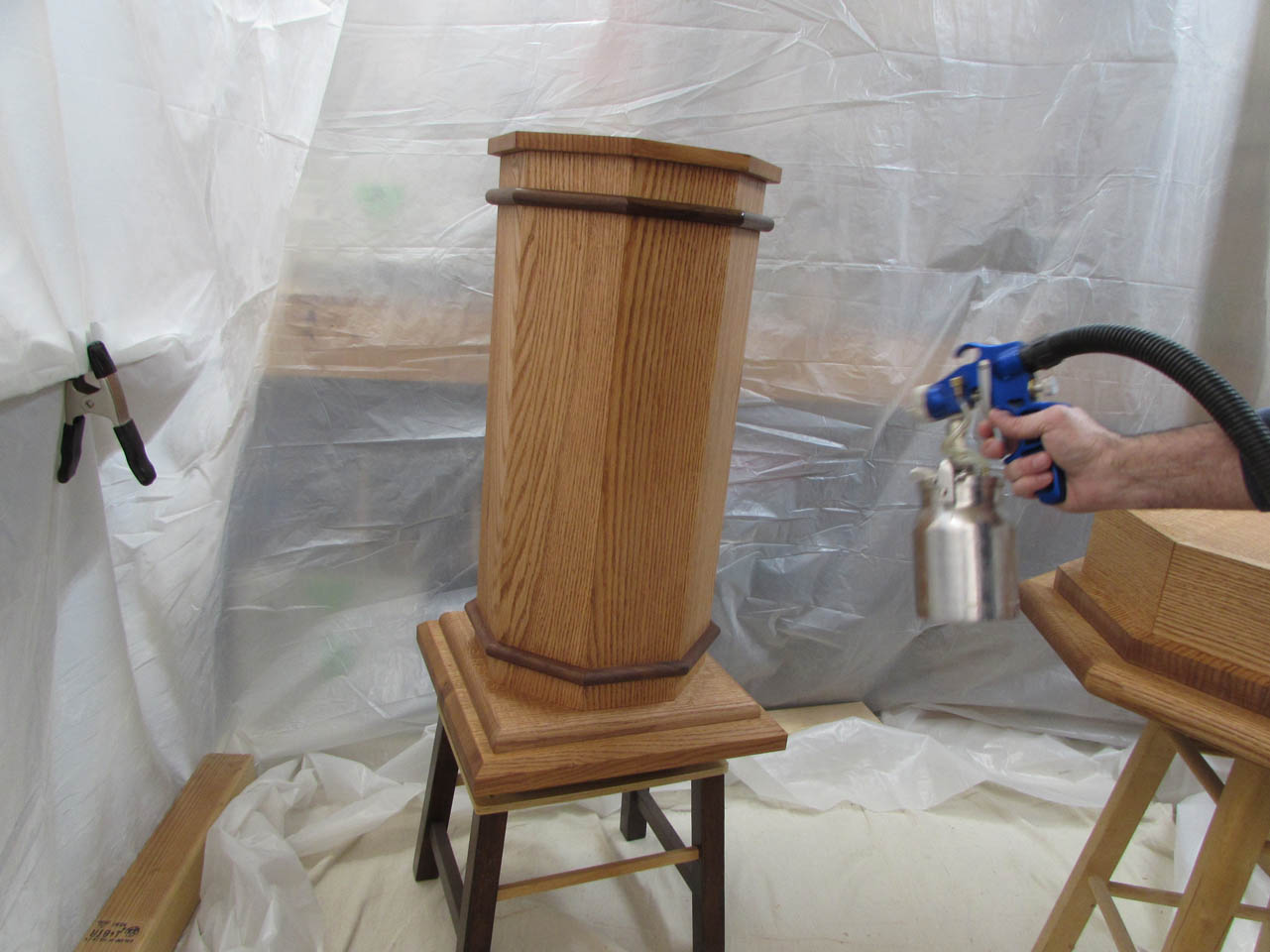 I set the column on a stool with a lazy Susan top. This allows me to tuck the column in the corner and spin it to apply polyurethane with my HVLP sprayer.
