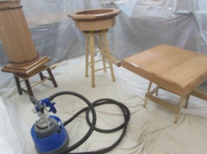 The rest of the pieces are on stools. I spray the bottom sides first, then flip them over onto painter’s pyramids and spray the tops.