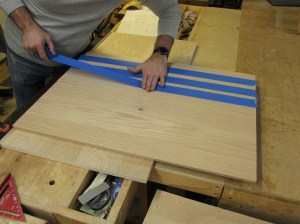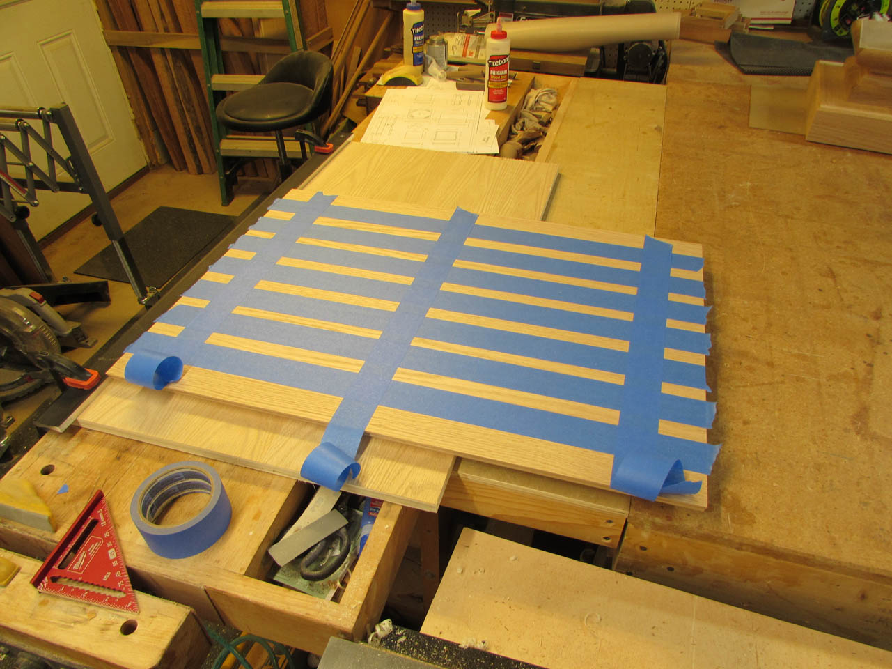With everything square and lined up, I attach a piece of 2″ wide painter’s tape to each joint to create a hinge for glue-up.