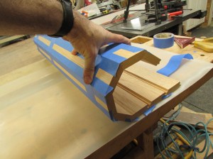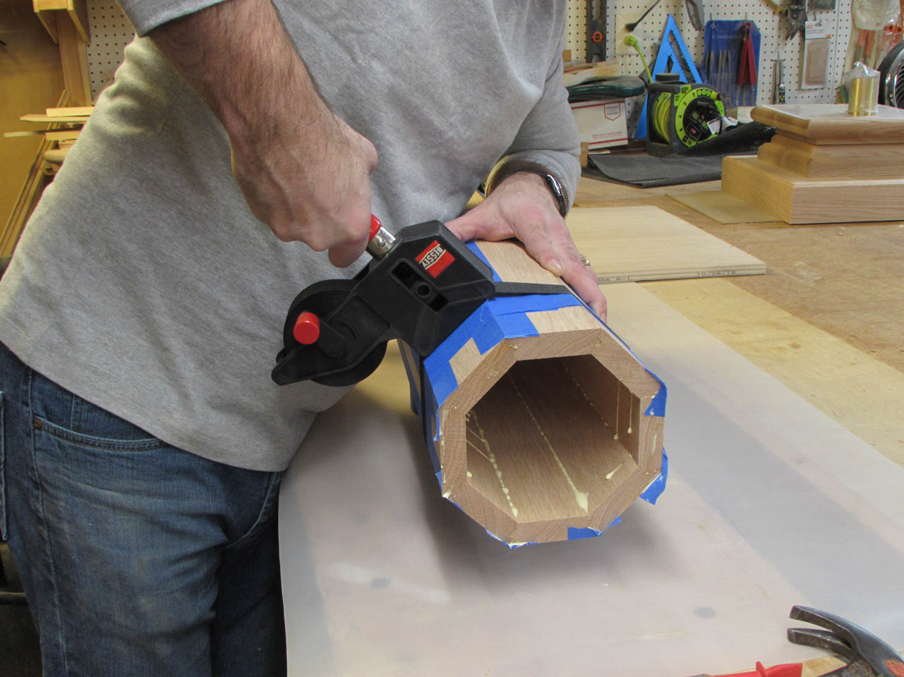 I used two strap clamps to apply even pressure all the way around and draw the sides more tightly together. Another thing that the tape does is prevent glue squeeze-out on the outside of the column.