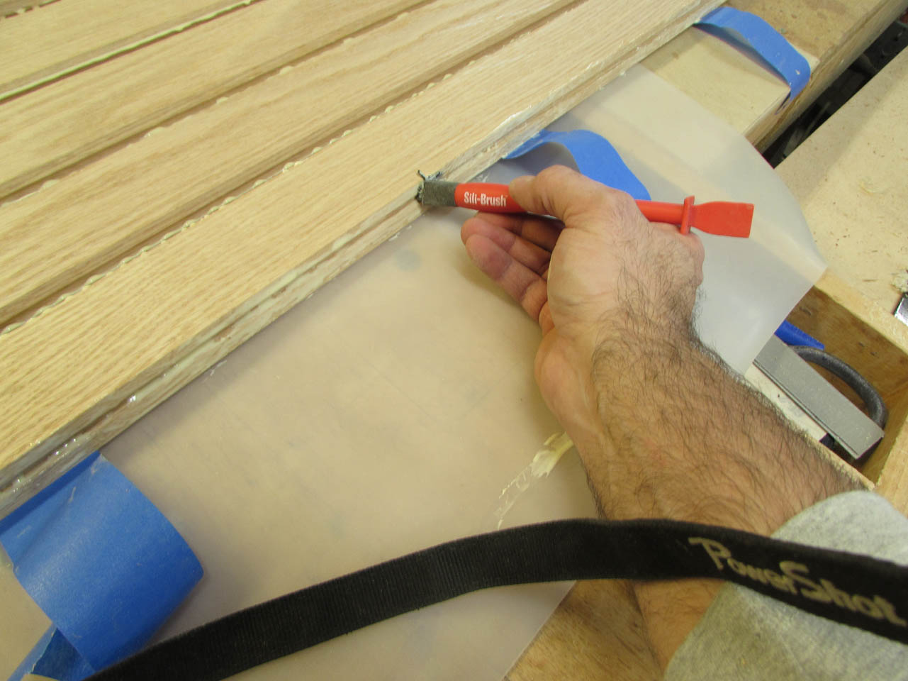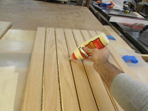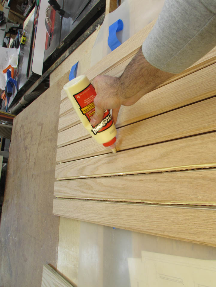 I liberally apply glue to each tongue & groove joint and brush glue onto the end joint as well.