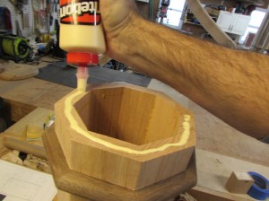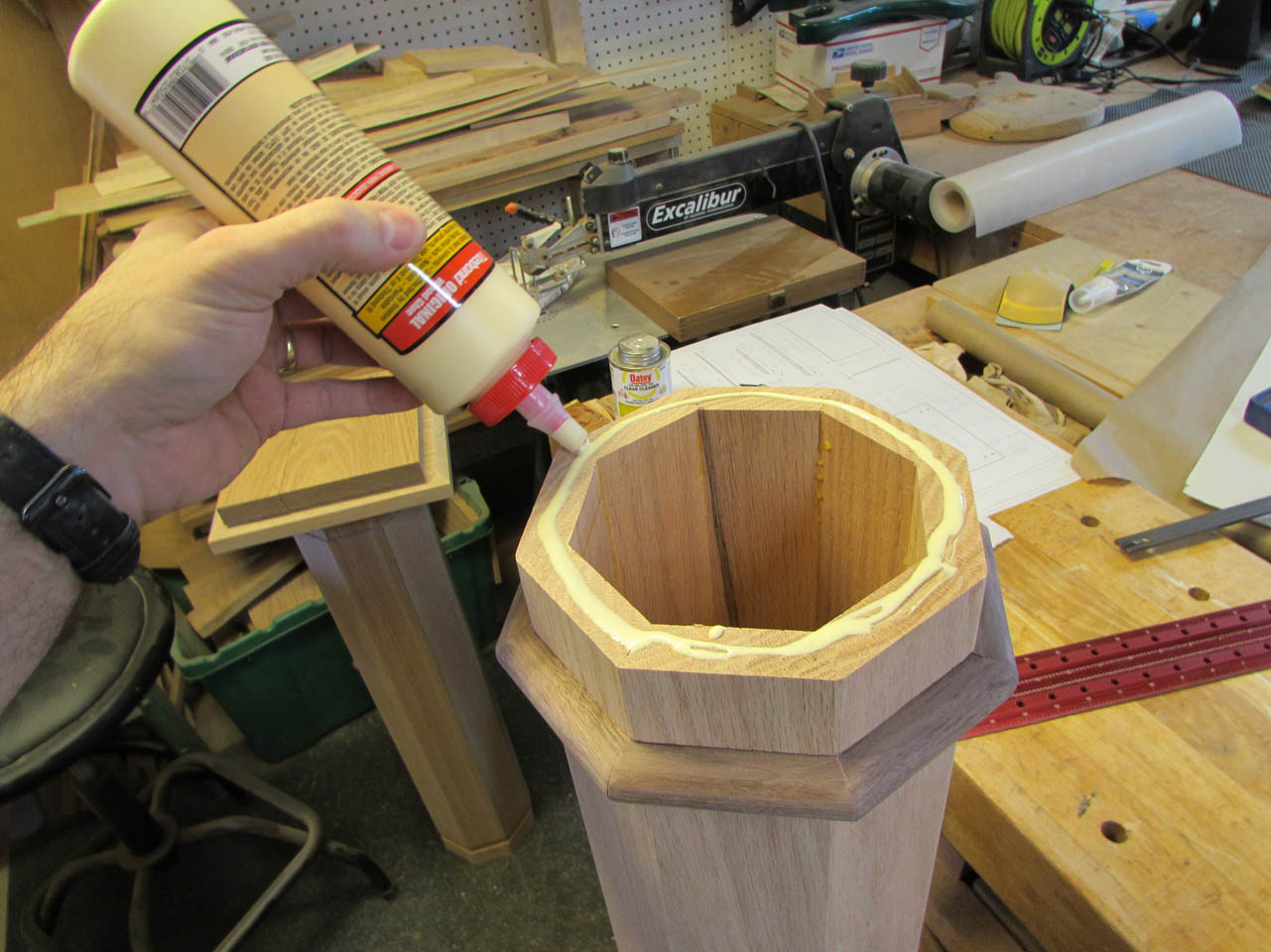 After applying glue to the base cap, I then raise the column up to center it on the base plate.