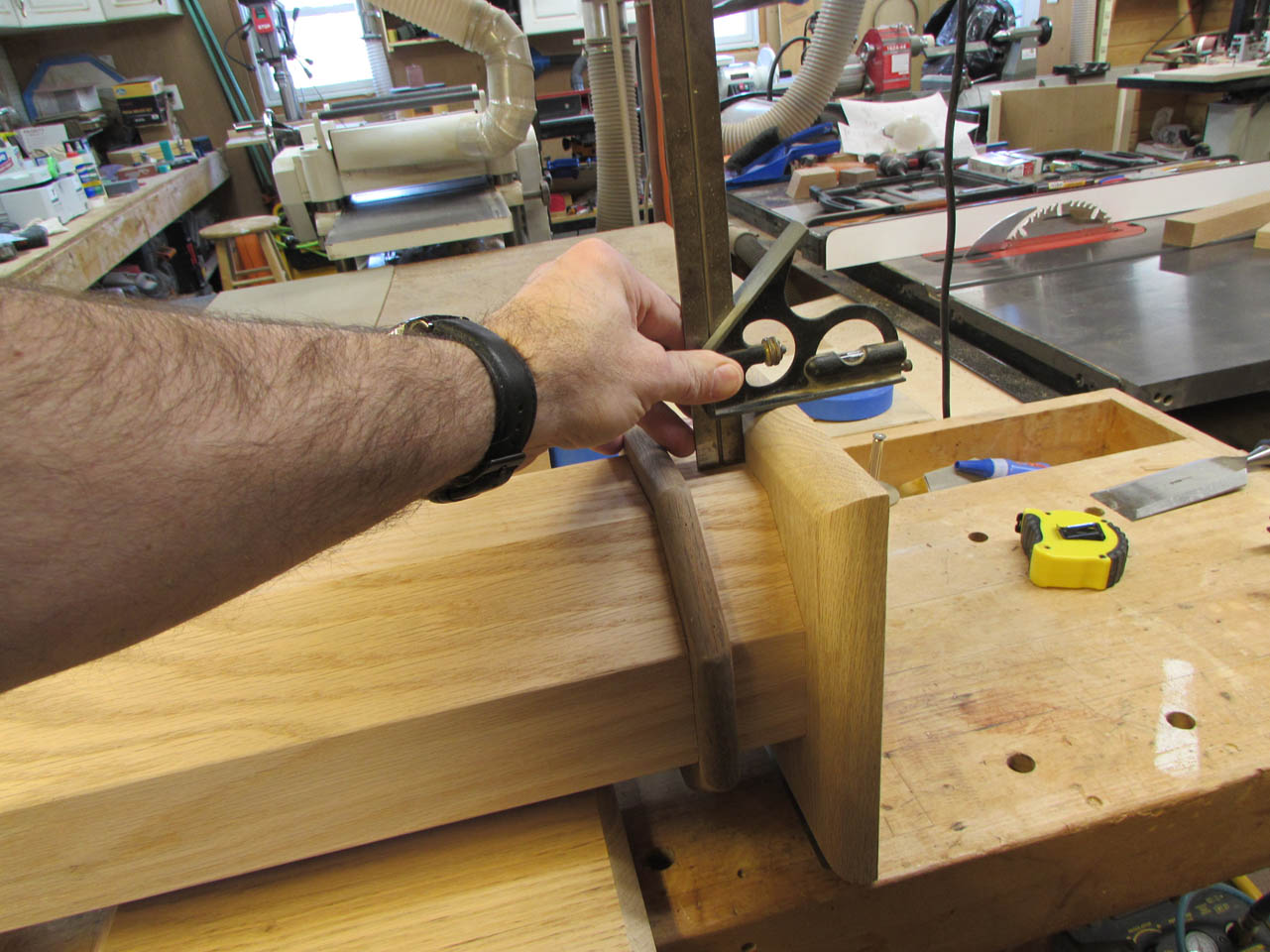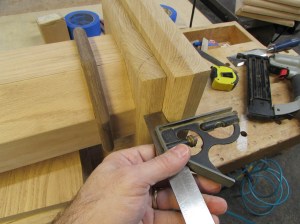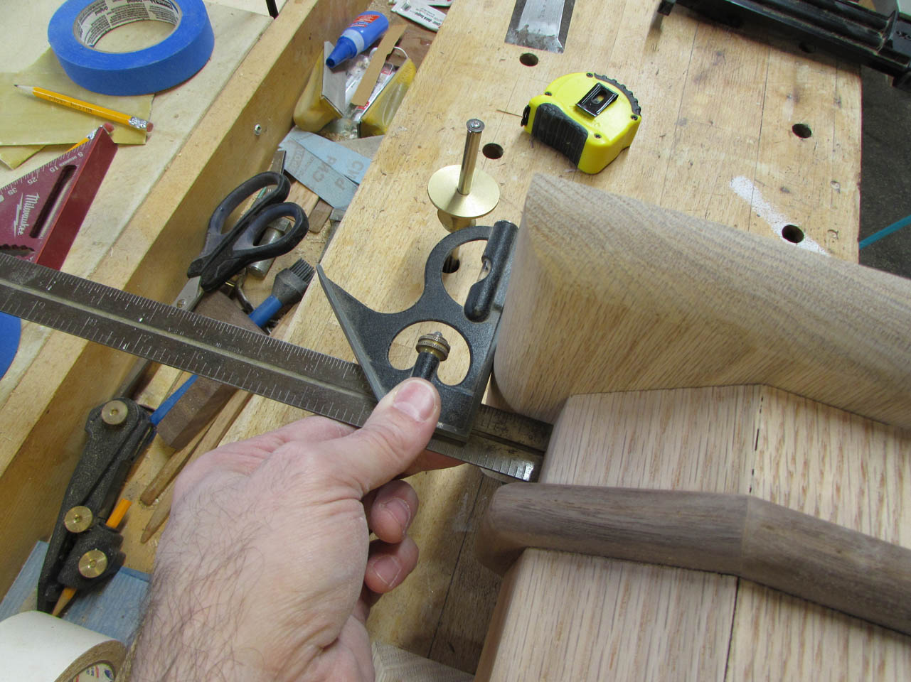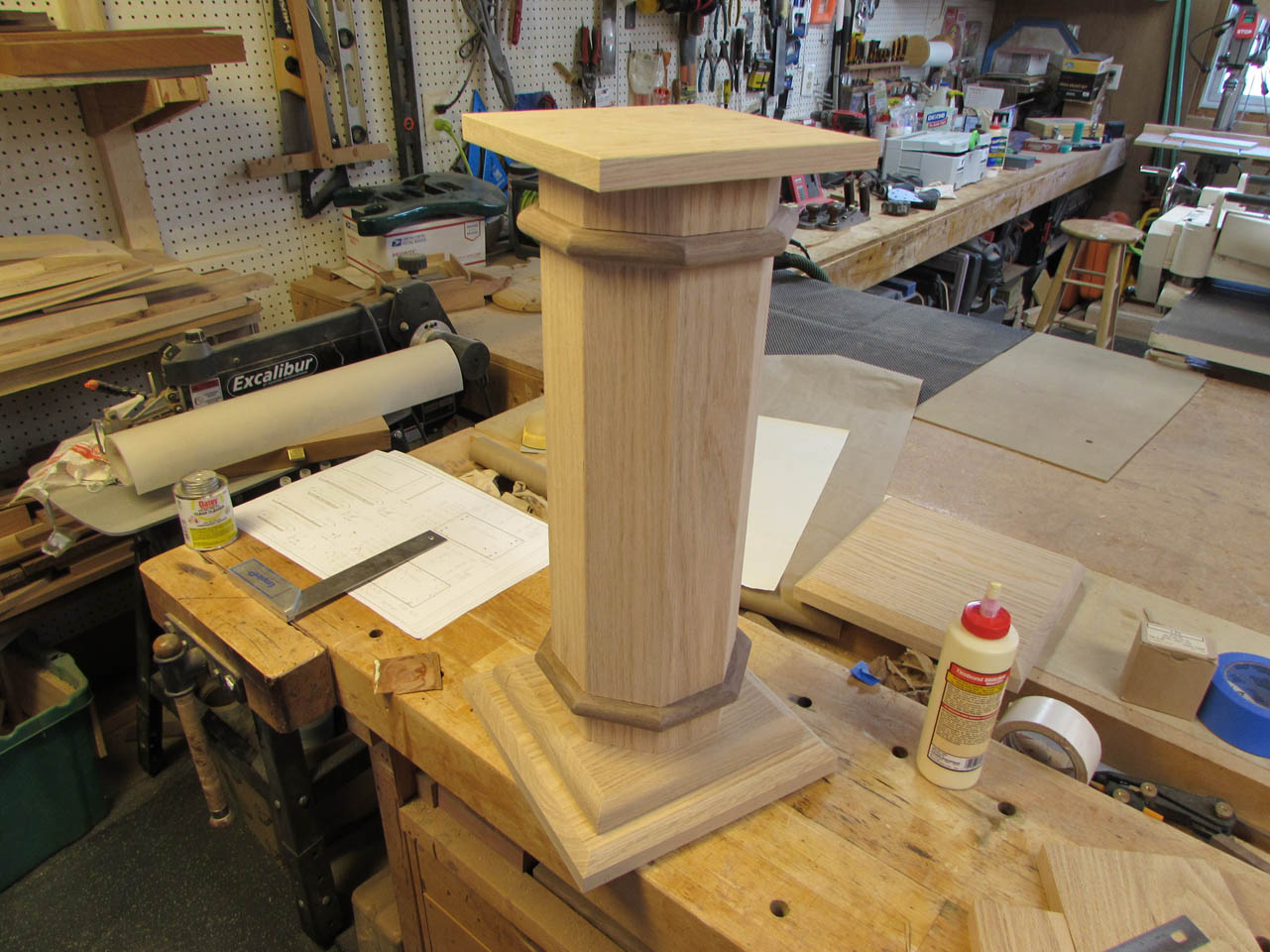 To assemble the base cap to the column, I elevate the column so that the base is centered vertically, then set my combination square to the depth from edge to column.