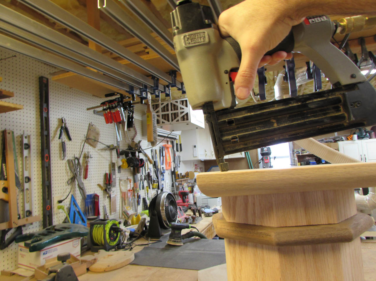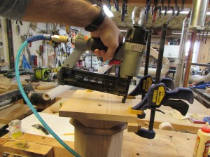 Then I use two brad nails to hold the base in place and stand the column up so I can then more easily aim the brad nailer to angle the nails in toward the center of the column to place a brad nail into each of the eight sides.