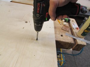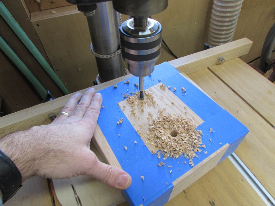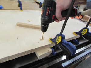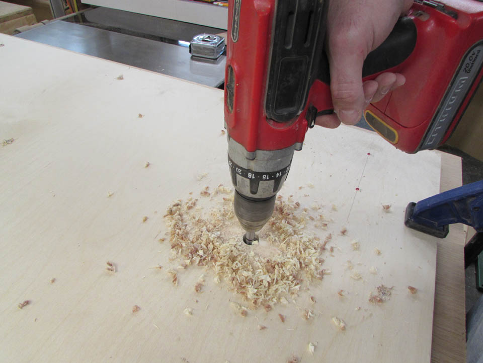Then I used a 3/4″ bit to drill two holes through the transition plate and halfway into the top plate.