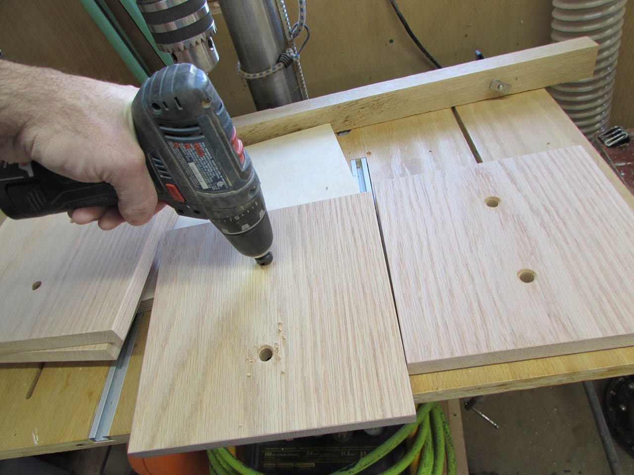 While the glue was drying, I drilled all of the holes through the second layer, using the same sheet as a drill template again.