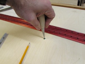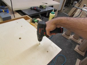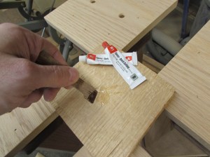 Next, I apply a bead of wood glue to the bottom of the column then press the base cap up against the glue after centering the cap horizontally with the combination square.