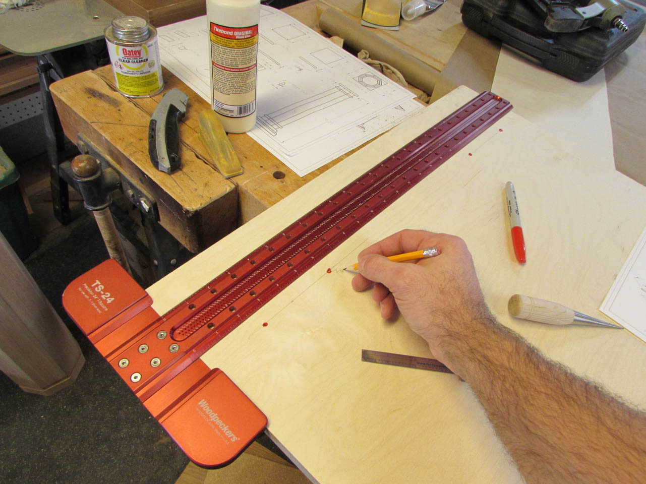 To locate the top plate, I clamped a 1″ block to either side.