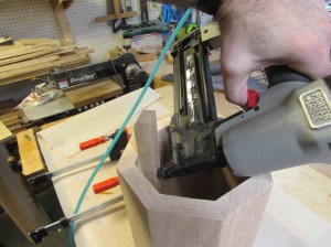 I held some of the first few pieces in place with 1-1/4″ brad nails while they cured. Note the rounded edges all facing out.